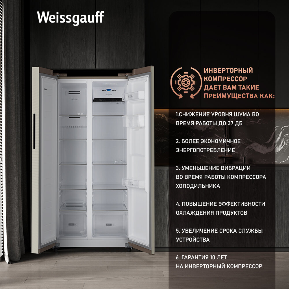 Отдельностоящий холодильник с инвертором и подачей воды Weissgauff WSBS 600 W NoFrost Inverter Water Dispenser Side by Side двухдверный, 3 года гарантии, Мощность замораживания 12 кг сутки, Объём 500 л, Сенсорное управление, Суперзаморозка, A+