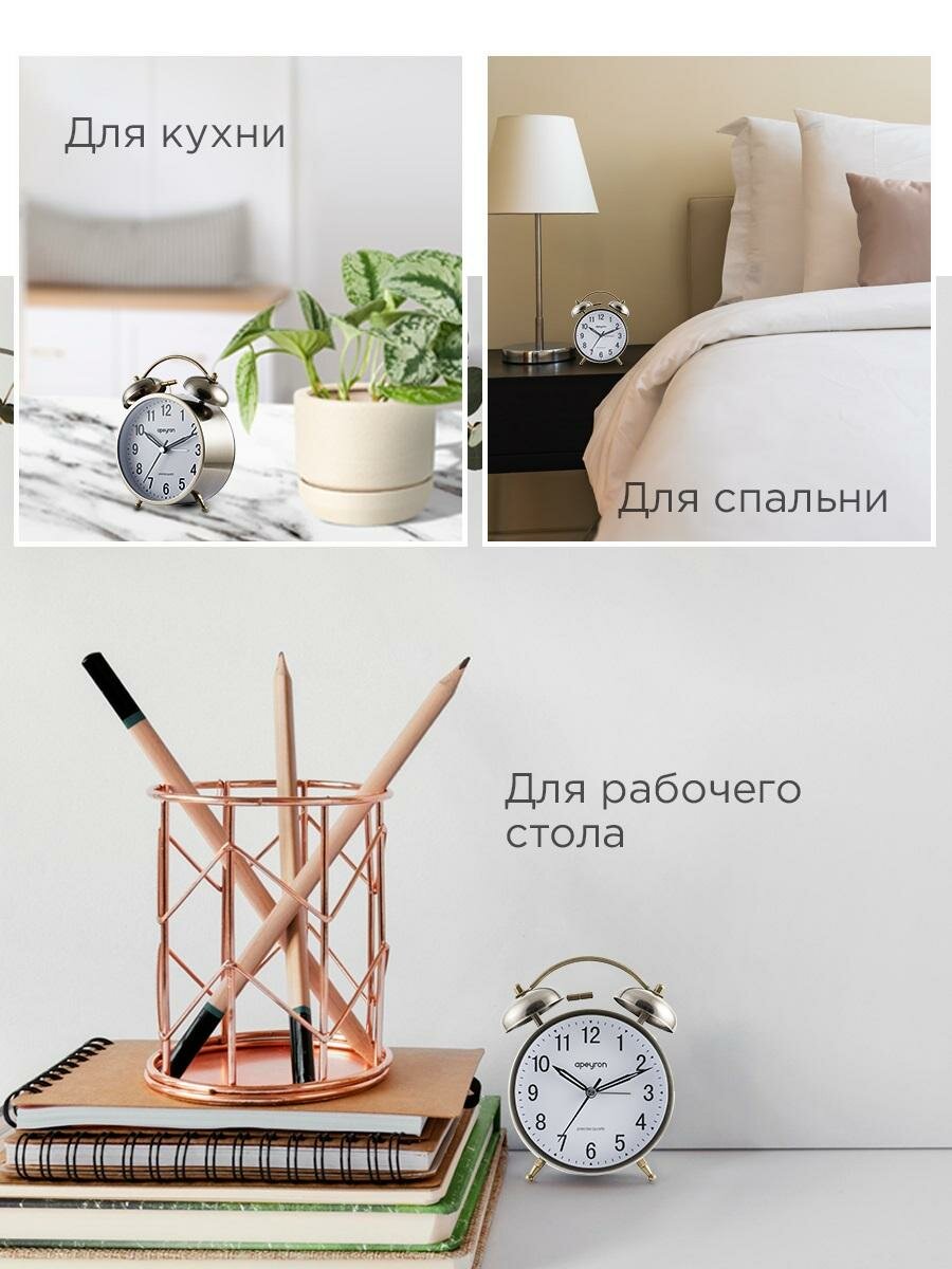 СохранитьЧасы-будильник с подсветкой 15.2х11.5 см, арабский циферблат, бесшумный механизм с плавным ходом, античная бронза, интересное: