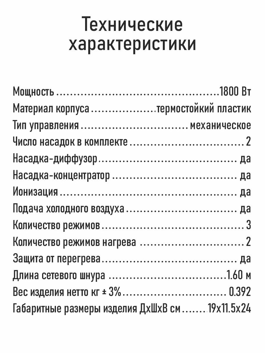 | Мощность фена | 1800 Вт |