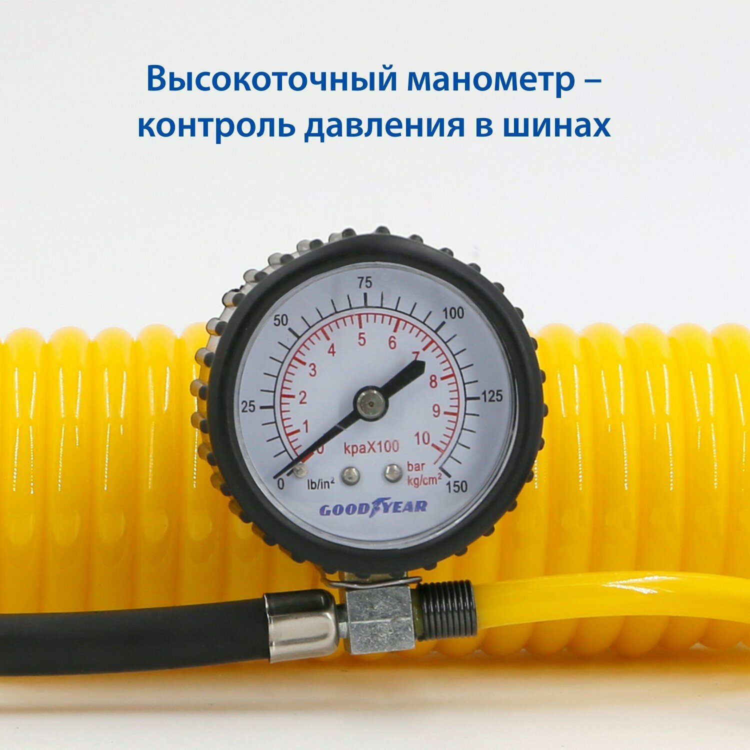 GOODYEAR GY000113 Компрессор автомобильный питание - от АКБ, манометр, с фонарем, съемный витой шланг, 12 V, 10 атм, 5