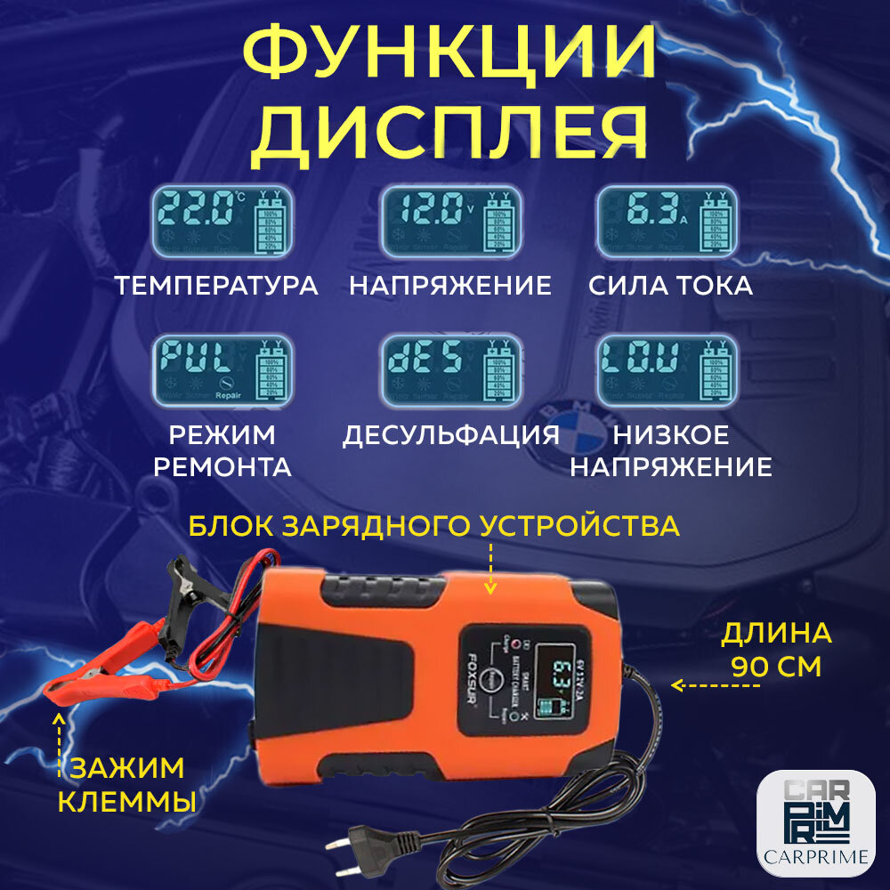 | Функции | автоматическое отключение зарядки / встроенный амперметр / встроенный вольтметр / подходит для AGM/GEL аккумуляторов / тест состояния АКБ |