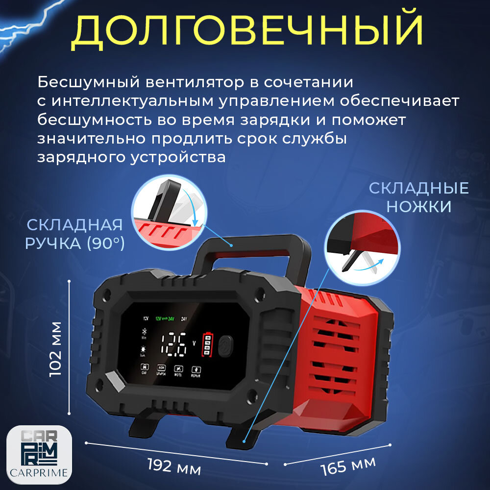 | Функции | автоматическое отключение зарядки / встроенный амперметр / встроенный вольтметр / подходит для AGM/GEL аккумуляторов / тест состояния АКБ |