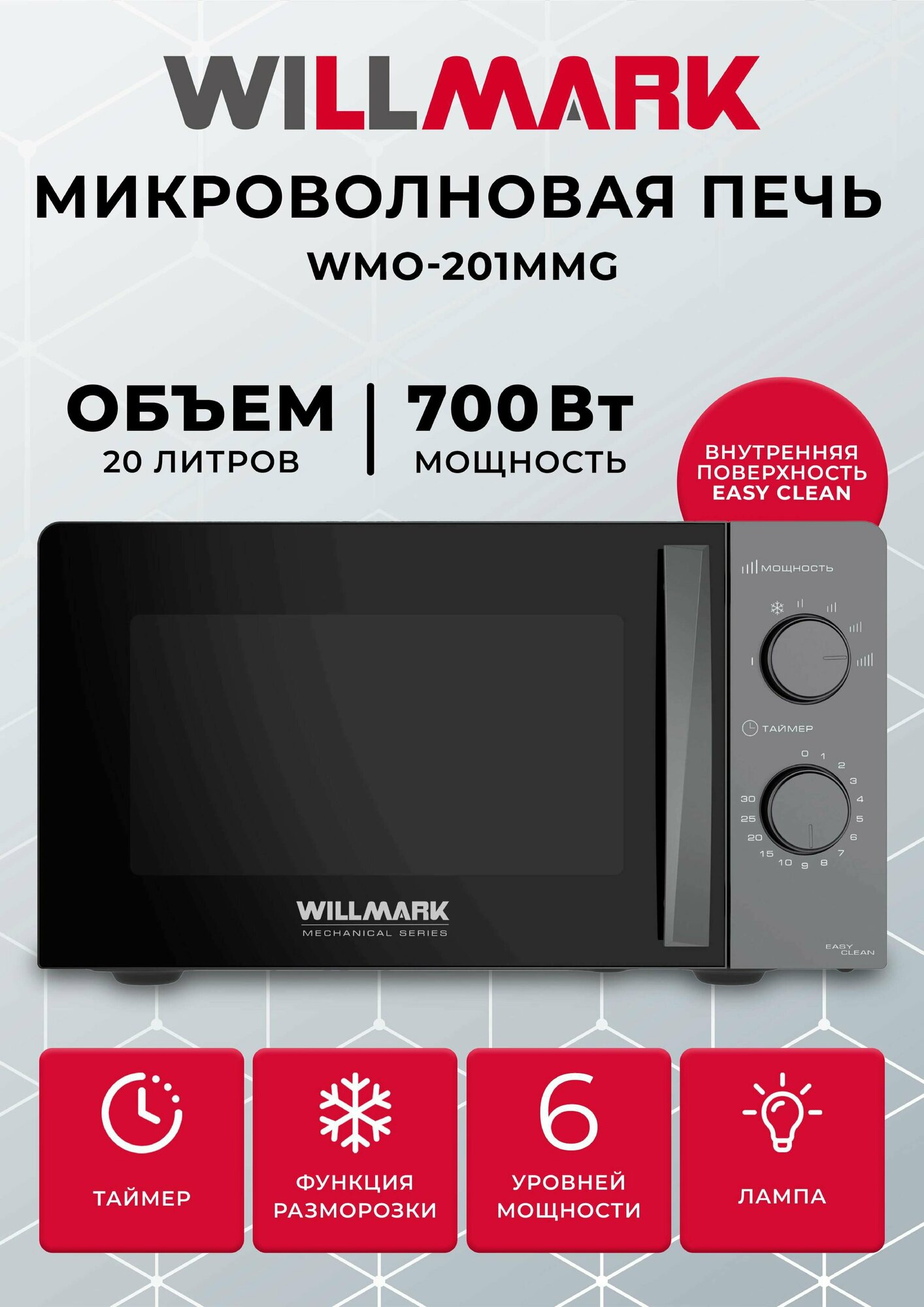 СохранитьМикроволновая печь WILLMARK WMO-201MMG (20л, 700Вт, механич.ПУ, ручка д/л откр.дв,6 ур.мощн., серая) интересное: