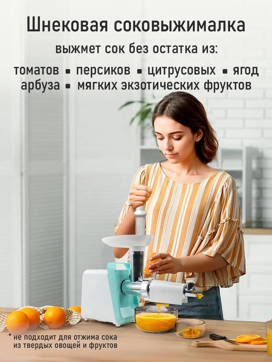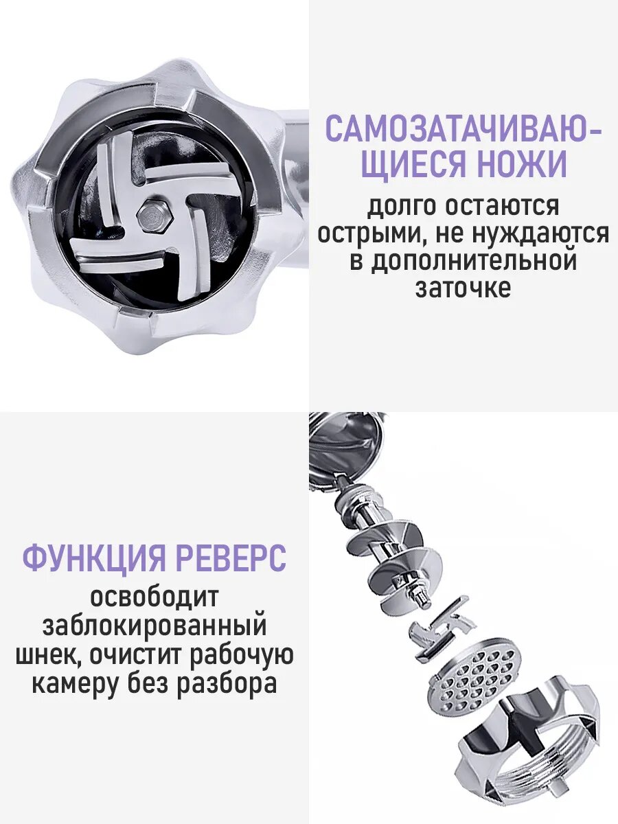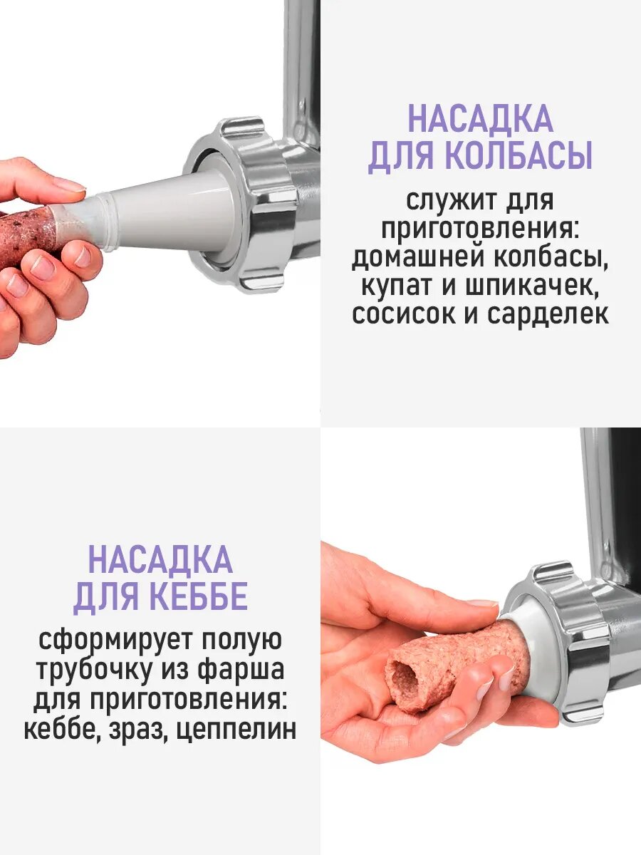 | Насадки | диск для фарша / насадка для кеббе / насадка для приготовления колбас / соковыжималка |