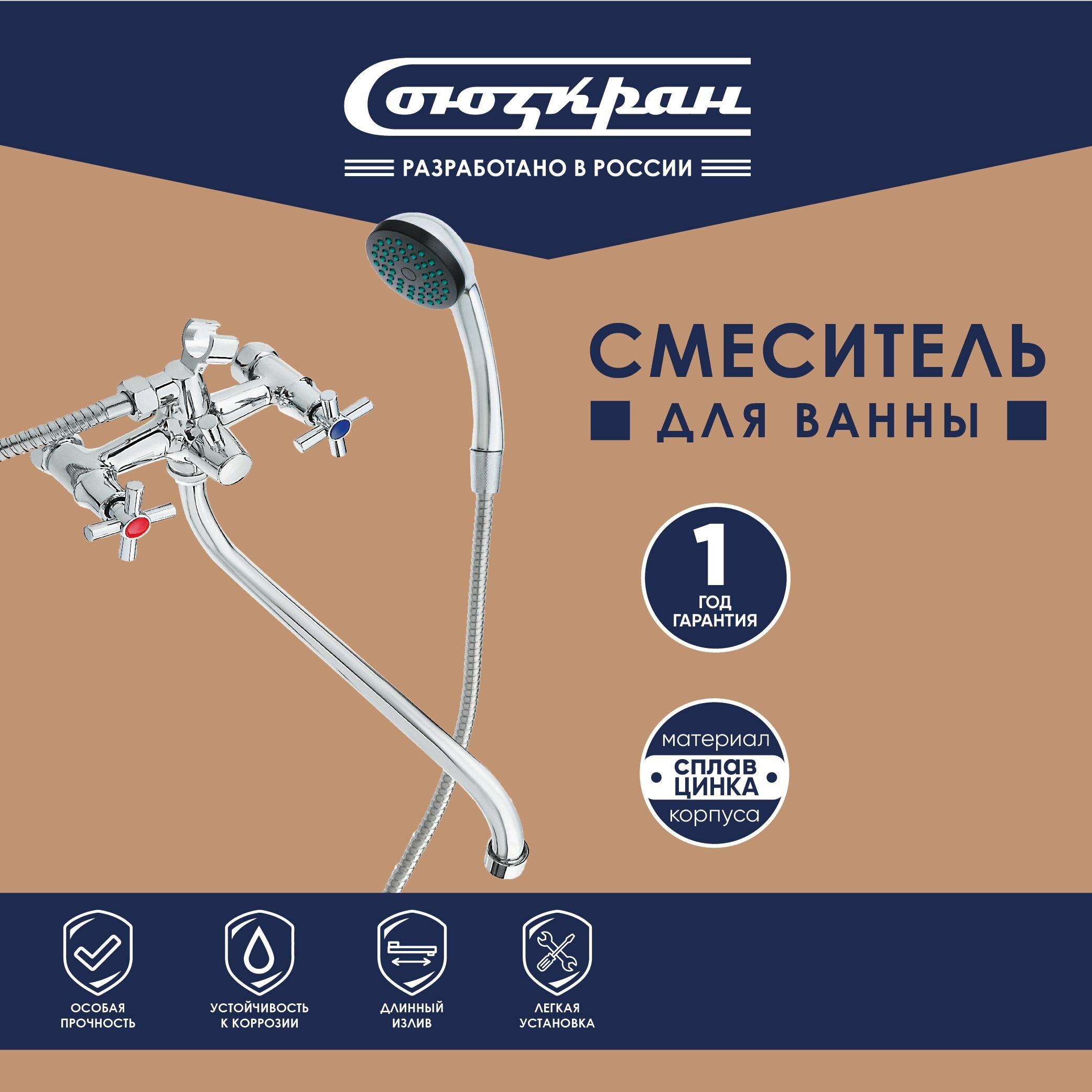 Смеситель для ванны с душем вентильный СоюзКран SK08-S217, длинный излив 30 см, лейка и шланг для душа в комплекте интересное: