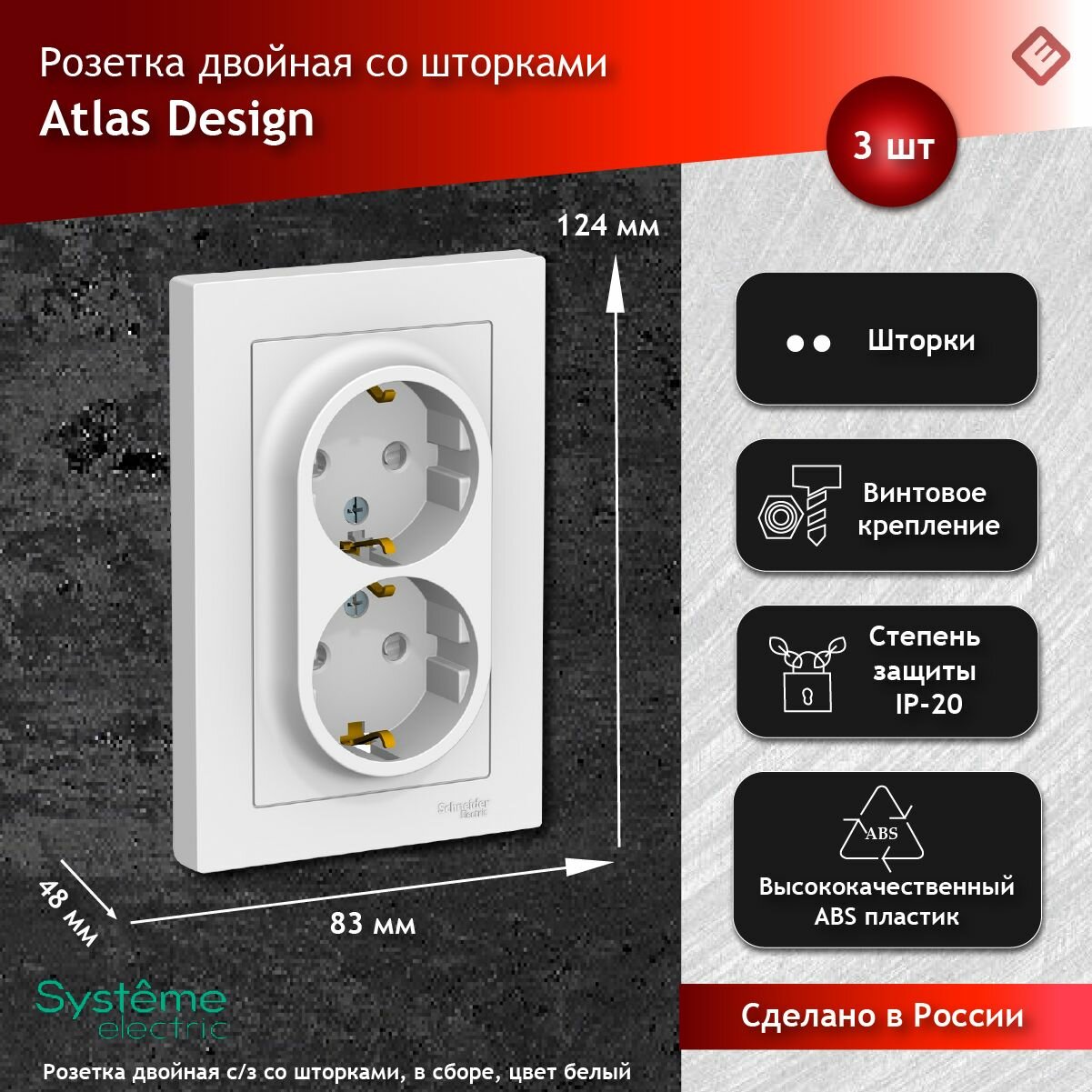 Розетка двойная 3 шт Atlas Design IP20 16А Schneider Electric / Systeme Electric скрытая установка с заземлением со шторками с рамкой белый Атлас Дизайн