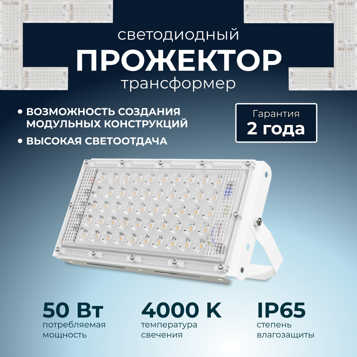 Светодиодный прожектор-трансформер с дневным белым цветом свечения 4000К / 4000Лм / 50Вт / IP65 / 220В-240В/50Гц / 107х212х27мм / белый интересное: