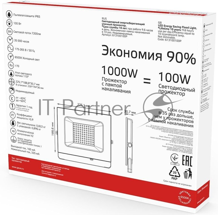 Прожектор светодиод 100Вт 6500К 7200Лм черный 175-265В PROMO IP65 СДО Gauss Elementary
