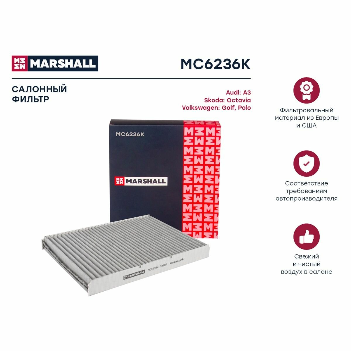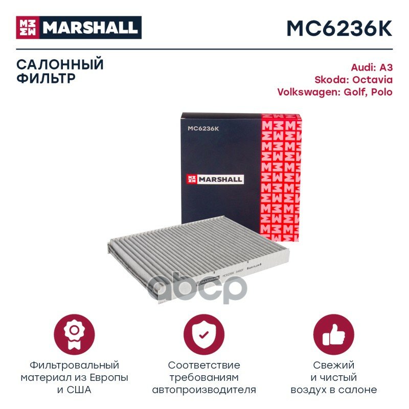 Купить Фильтр салонный угольный Audi A3 (8L) 96-, Skoda Octavia I 96-, VW Golf IV 97- (MC6236K), Marshall MC6236K