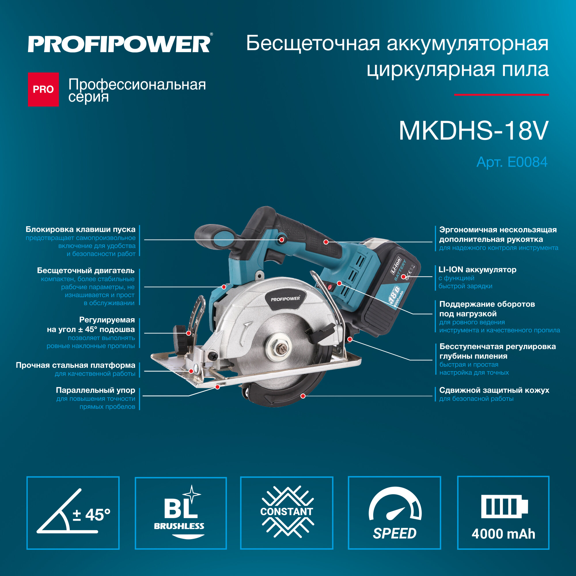 Купить Пила дисковая аккумуляторная PROFIPOWER MKDHS-18V, Li-ion 2шт+з.у.