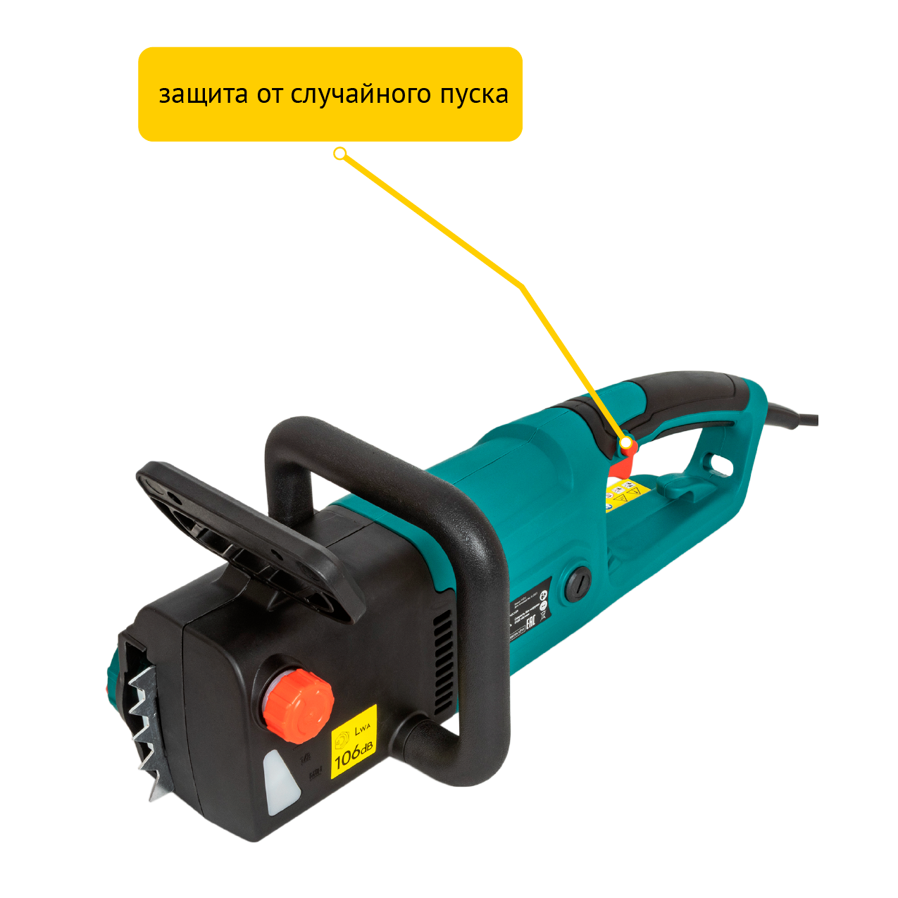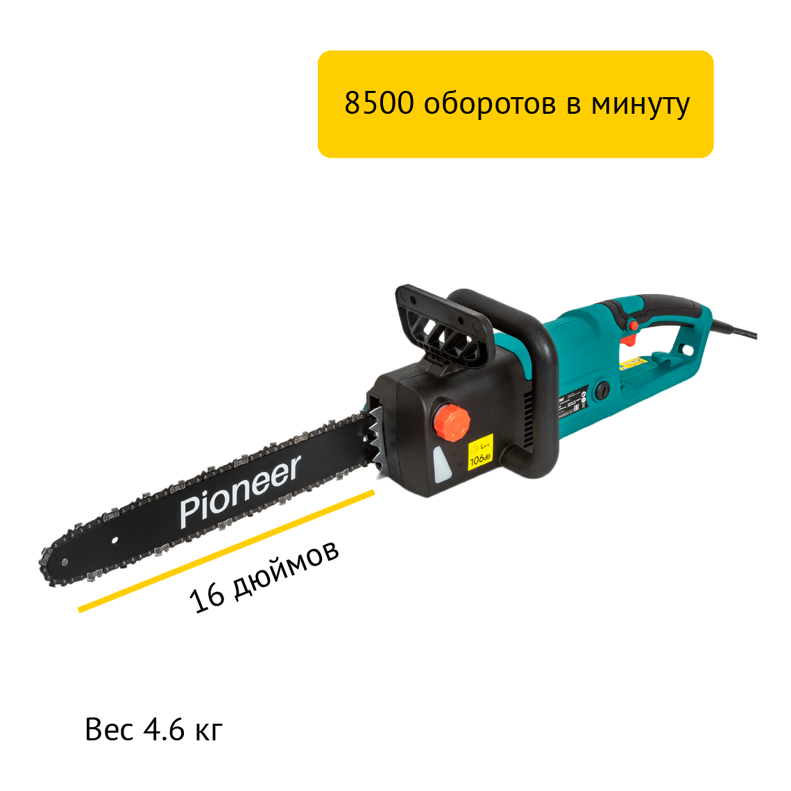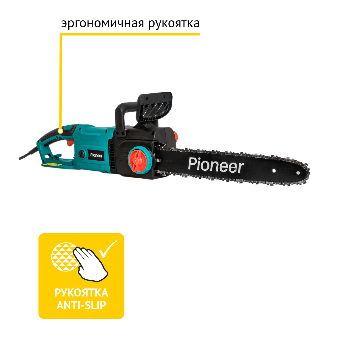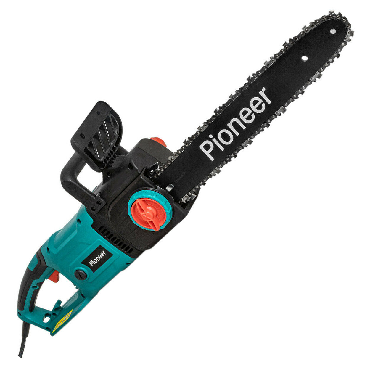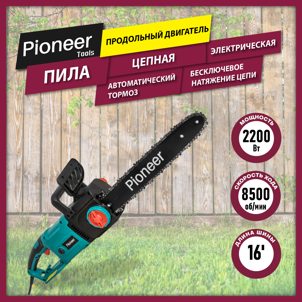 Пила цепная электрическая Pioneer ECS-2200-16V с щеточным двигателем, бесключевая регулировка натяжения, быстрая замена щеток, автоподача масла, автоматический тормоз, 8500 об/мин, 2200 Вт