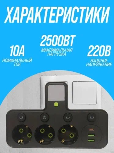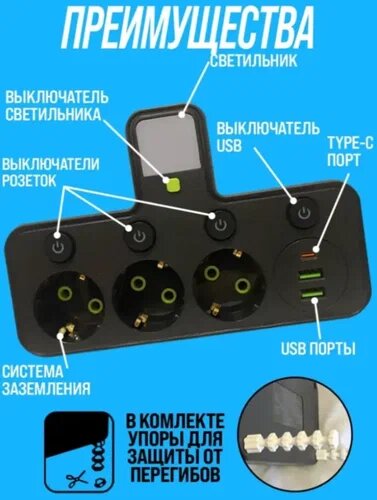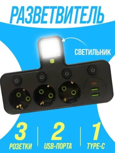 Тройник разветвитель сетевой 2 розетки 2 USB + Type-C с подсветкой