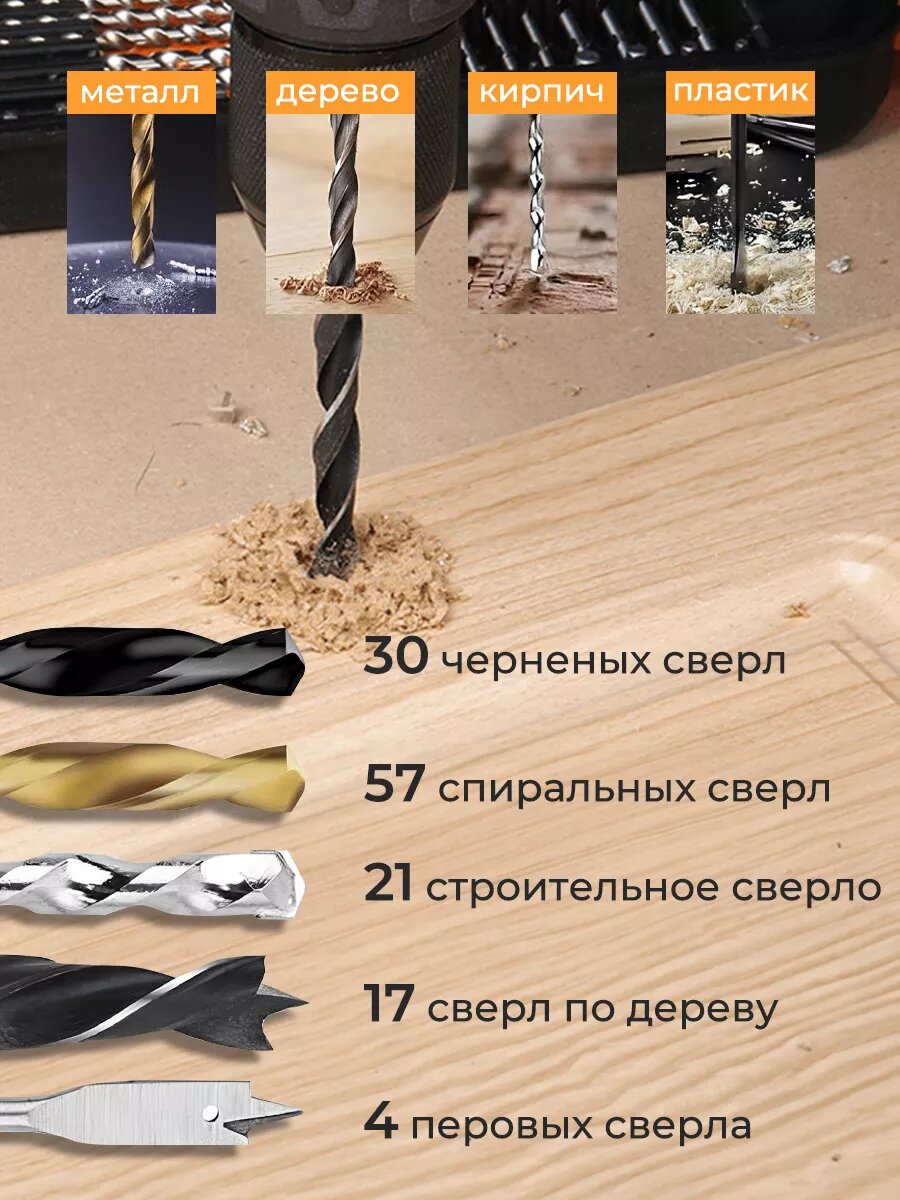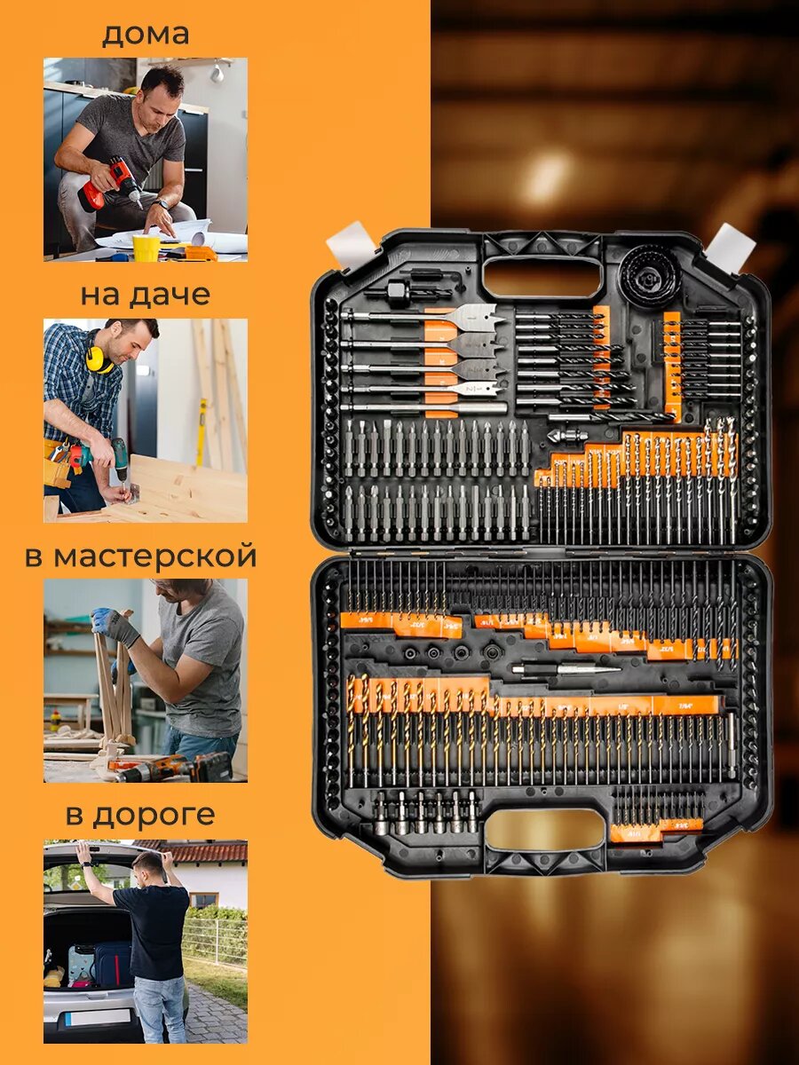 | Подробная комплектация | Набор инструментов - 1 шт /246 предметов/ (Титановые спиральные сверла HSS - 57 шт. Спиральные сверла из черного оксида HSS - 30 шт. Сверла по дереву - 17 шт. Плоские сверла по дереву - 4 шт. Удлинитель лопаточного бита 6 дюймов - 1 шт. Сверла по камню - 21 шт. Стопоры для сверл - 4 шт. Биты отвертки 66 х 25 мм - 66 шт. Биты отвертки 30 х 50 мм - 30 шт. Гайковерты - 6 шт Шестигранные ключи - 2 шт. Зенковка - 1 шт. Кольцевые пилы - 4 шт. Адаптер для кольцевых пил - 1шт. Бородок добойник - 1 шт. Держатель бит - 1 шт.) |