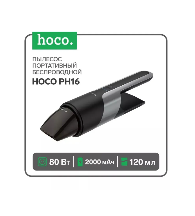 Hoco Портативный пылесос Hoco PH16, беспроводной, 2000 мАч, 80 Вт, ёмкость 120 мл, черный