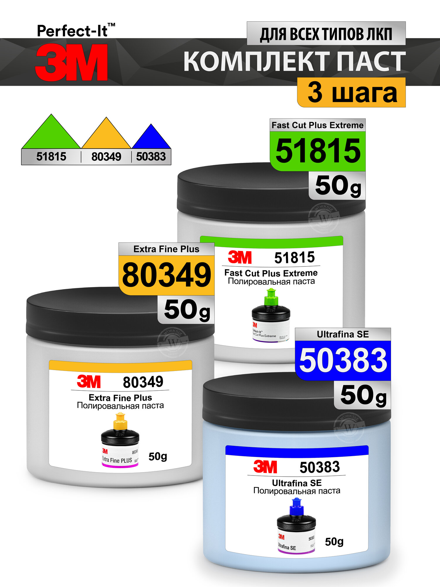 СохранитьПаста / комплект для полировки 3М™ Perfect-it™ / 3 шага : 3М 51815 Зеленый колпачок 50 г + 3М 80349 Желтый 50 г + 3М 50383 Синий 50 г интересное:
