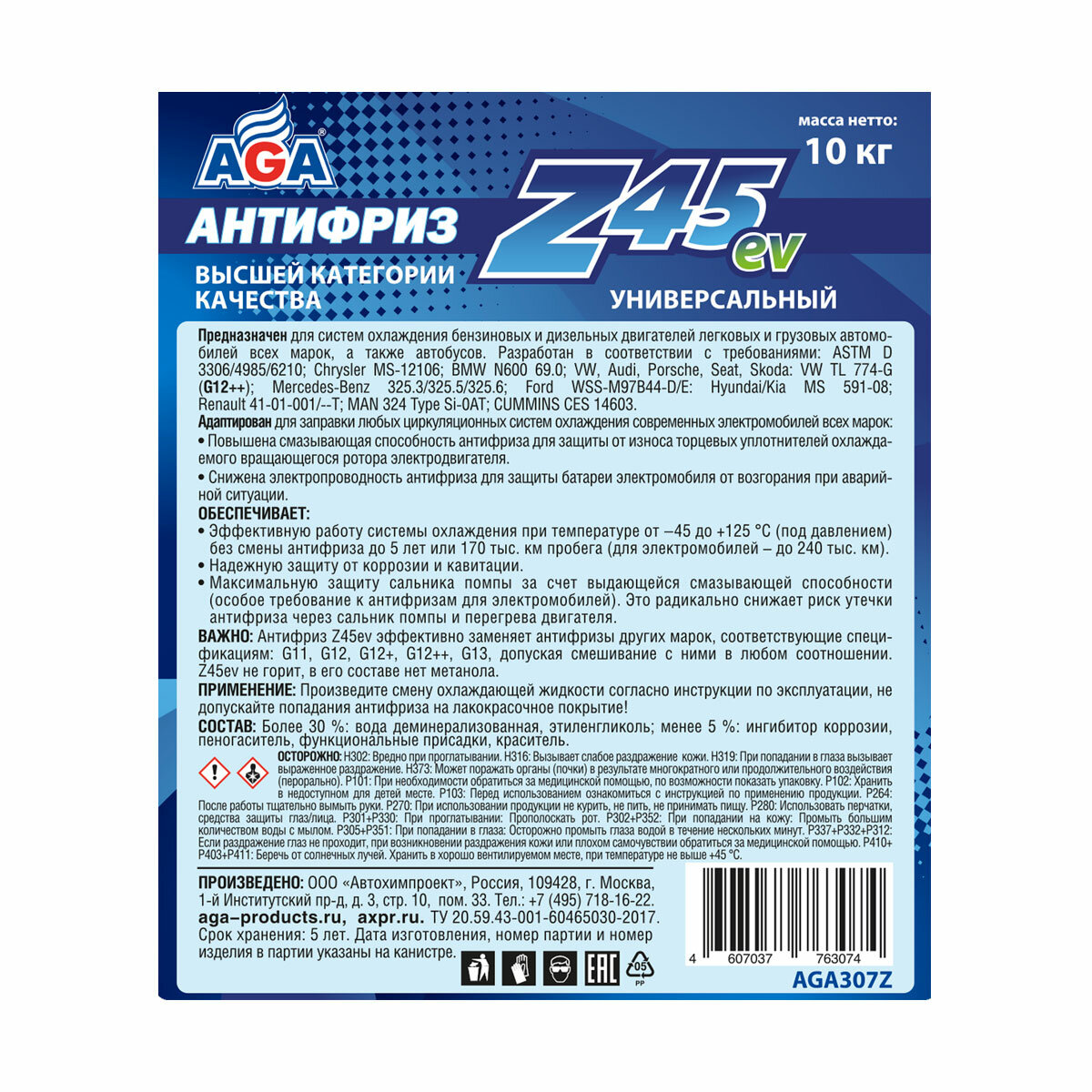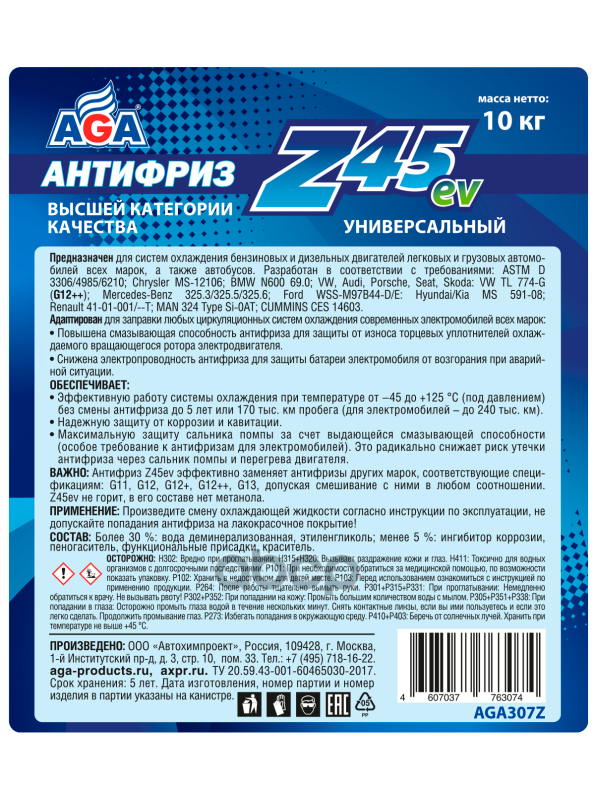Антифриз AGA Z45 синий -45С 10 кг. G-12++ AGA307Z интересное:
