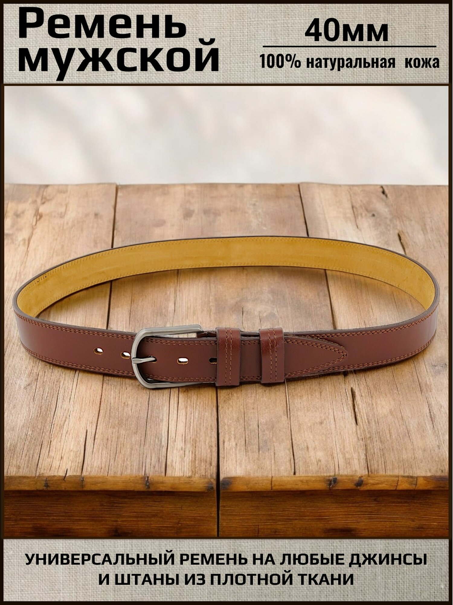 Ремень мужской кожаный Aksy Belt коричневый, 40мм, 2 строчка, Италия, матовое серебро, 130 см
