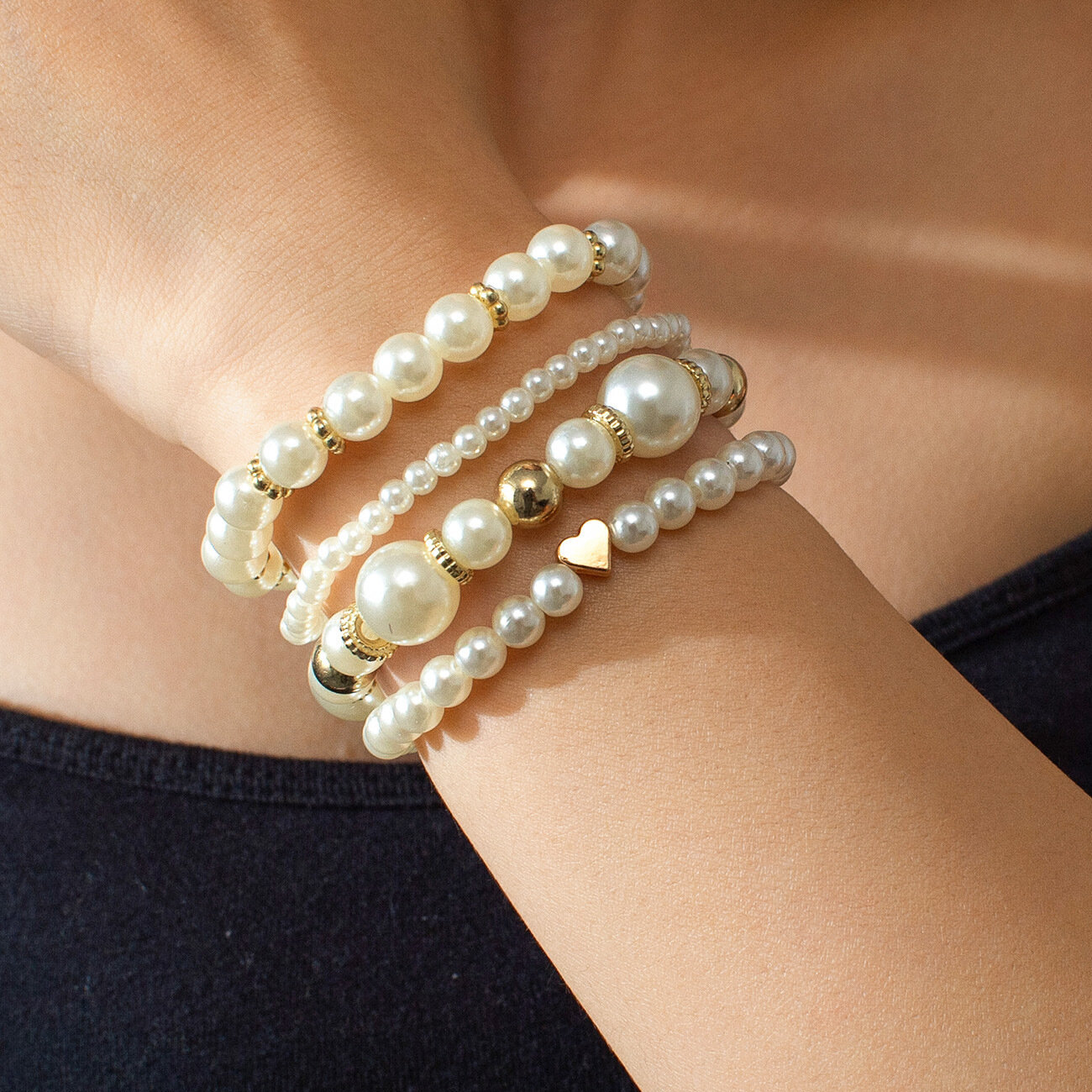 Купить Набор браслетов на руку, 4 штуки в наборе, цвет жемчужный/золотистый, имитация жемчуга