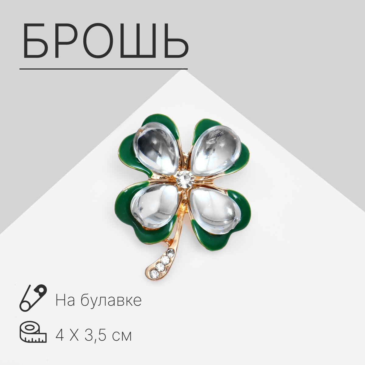 Брошь "Клевер" четырёхлистный со стразой, цвет бело-зелёный в золоте 7624624