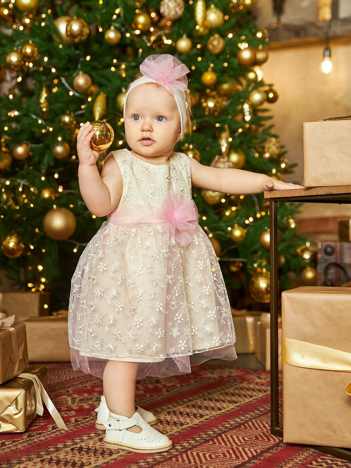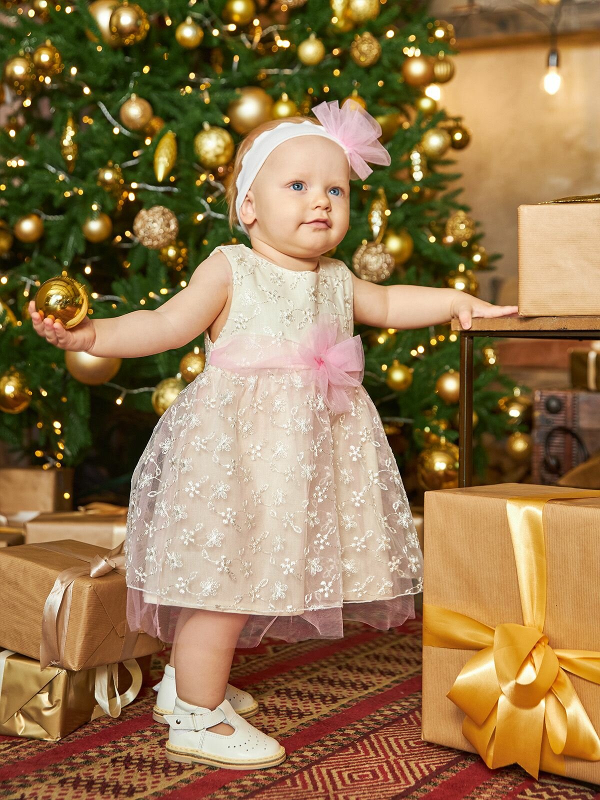 Платье для девочки Осьминожка нарядное и повязка на голову для девочки, цвет молочный, размер 92