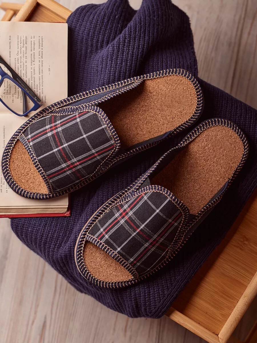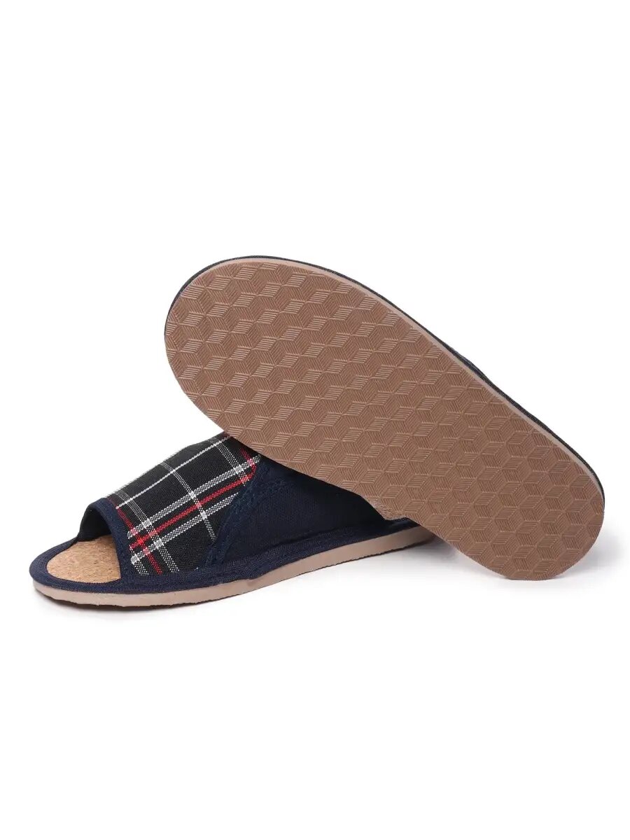 СохранитьМужские домашние тапки "LepiloV", открытые, на пробковой стельке, с резинками. Размер 45. Синяя клетка. интересное: