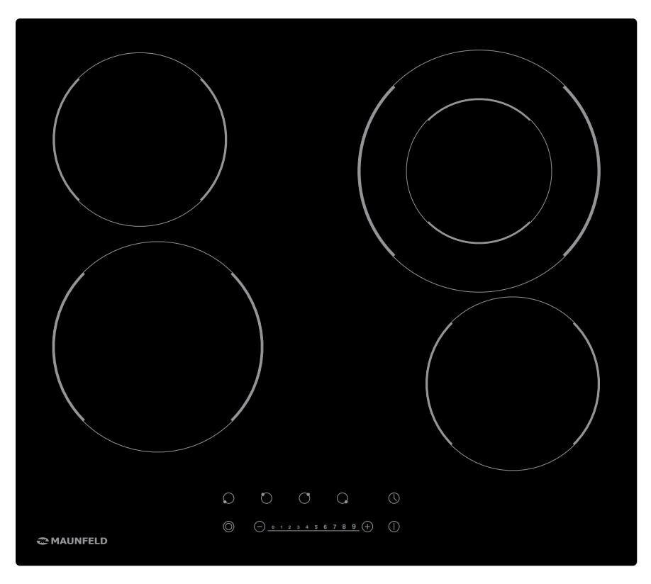 Электрическая панель MAUNFELD EVCE.594F.D-BK/ Электрическая, 590х520х62 мм, управление: фронтальное,сенсорно-слайдерное, 4 конфорки, стеклокерамика, черный цвет