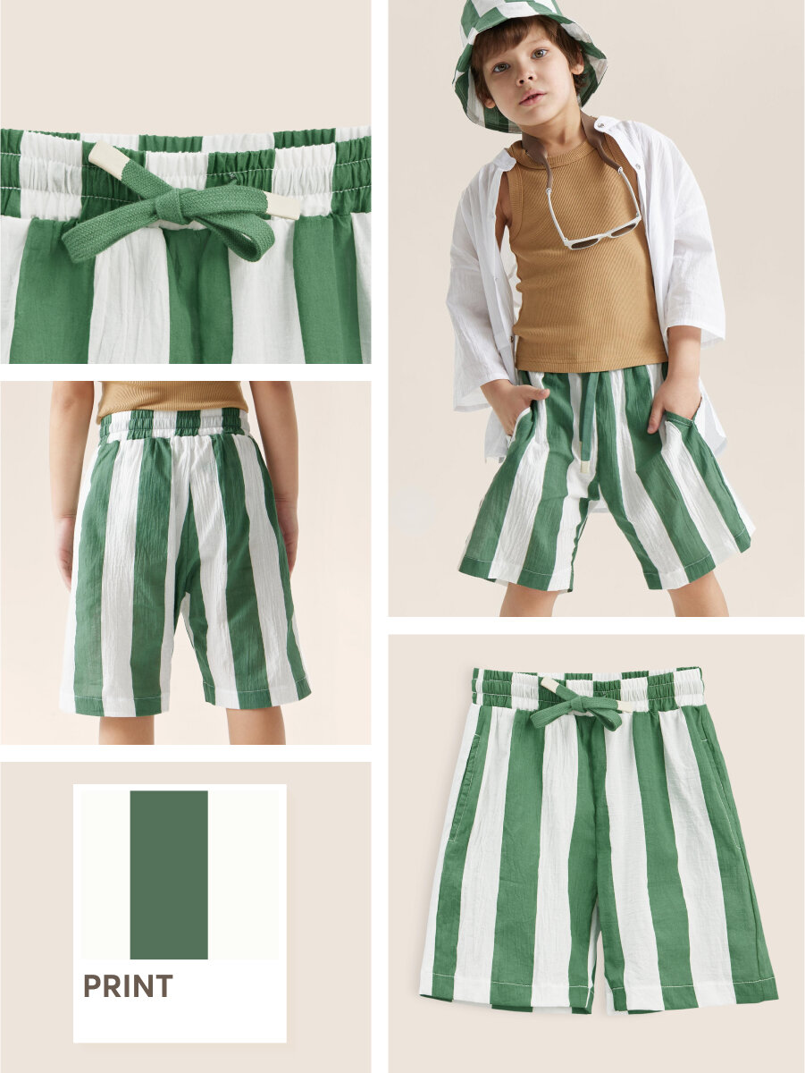 Купить 88120, Шорты детские хлопковые Happy Baby, шорты для мальчика и для девочки, на завязках, летние, для пляжа, зеленые в полоску, размер 128-134