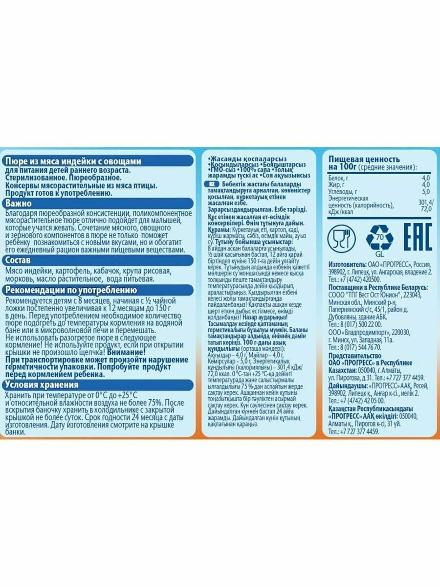 | Дополнительная информация | хранить при температуре от 0 °С до +25 °С и относительной влажности воздуха не более 75%, после вскрытия банку хранить в холодильнике не более суток, беречь от солнечных лучей; внимание! при транспортировке может произойти нарушение герметичности упаковки, попробуйте продукт перед кормлением ребенка |