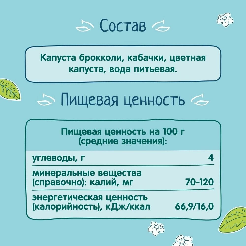| Состав | капуста брокколи / кабачки / цветная капуста / вода питьевая |