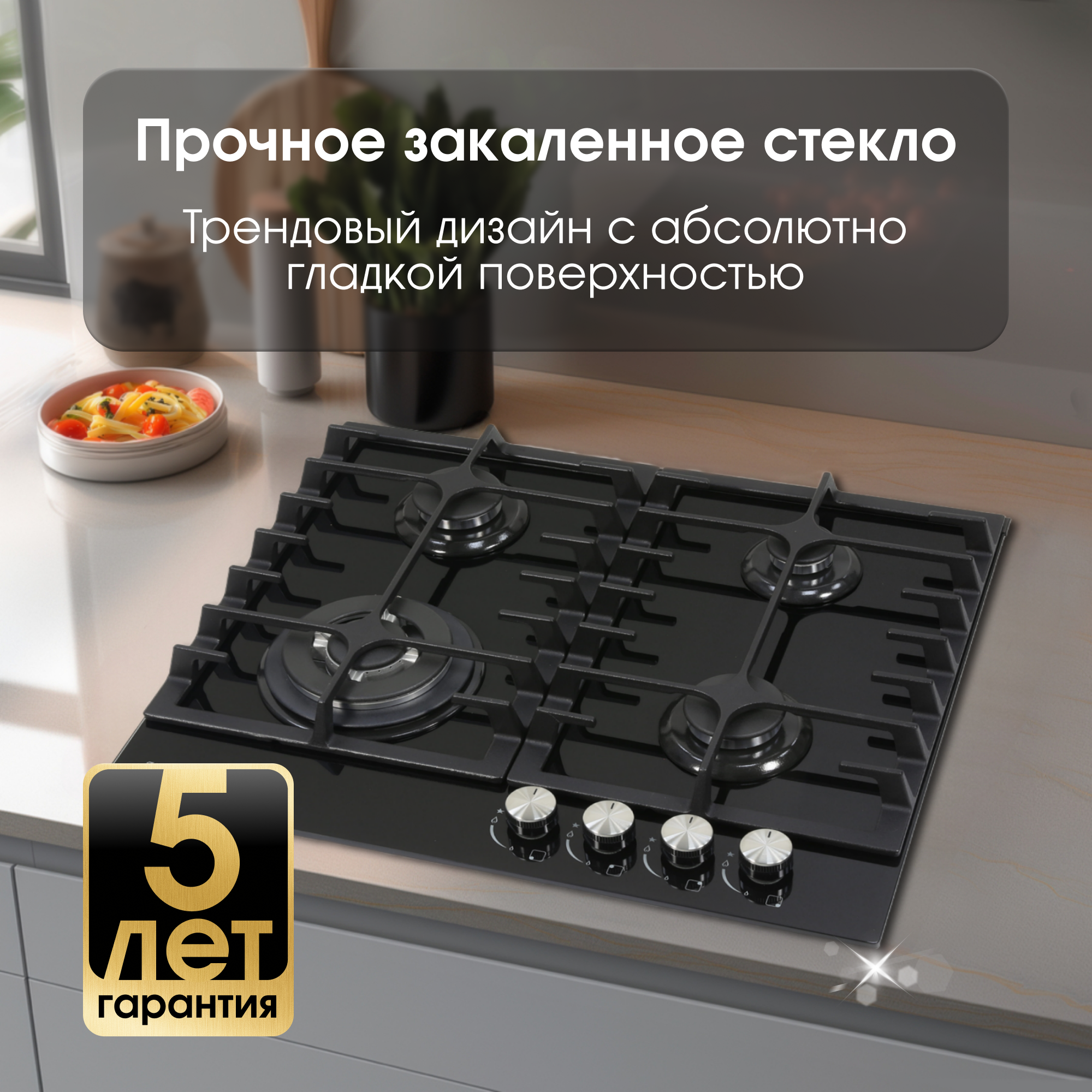 Варочная панель газовая встраиваемая Зигмунд & Штейн MN 197.61 B закаленное стекло черный 9.9х584х510мм 4 конфорки 2 решетки / газ-контроль /