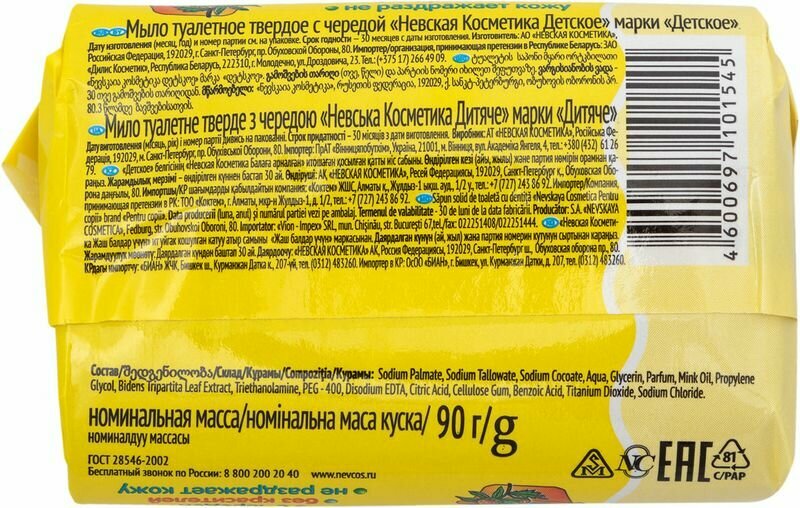 | Комплектация | Детская серия (Невская косметика) туалетное мыло с чередой Детское, 100 г, 4 шт. |