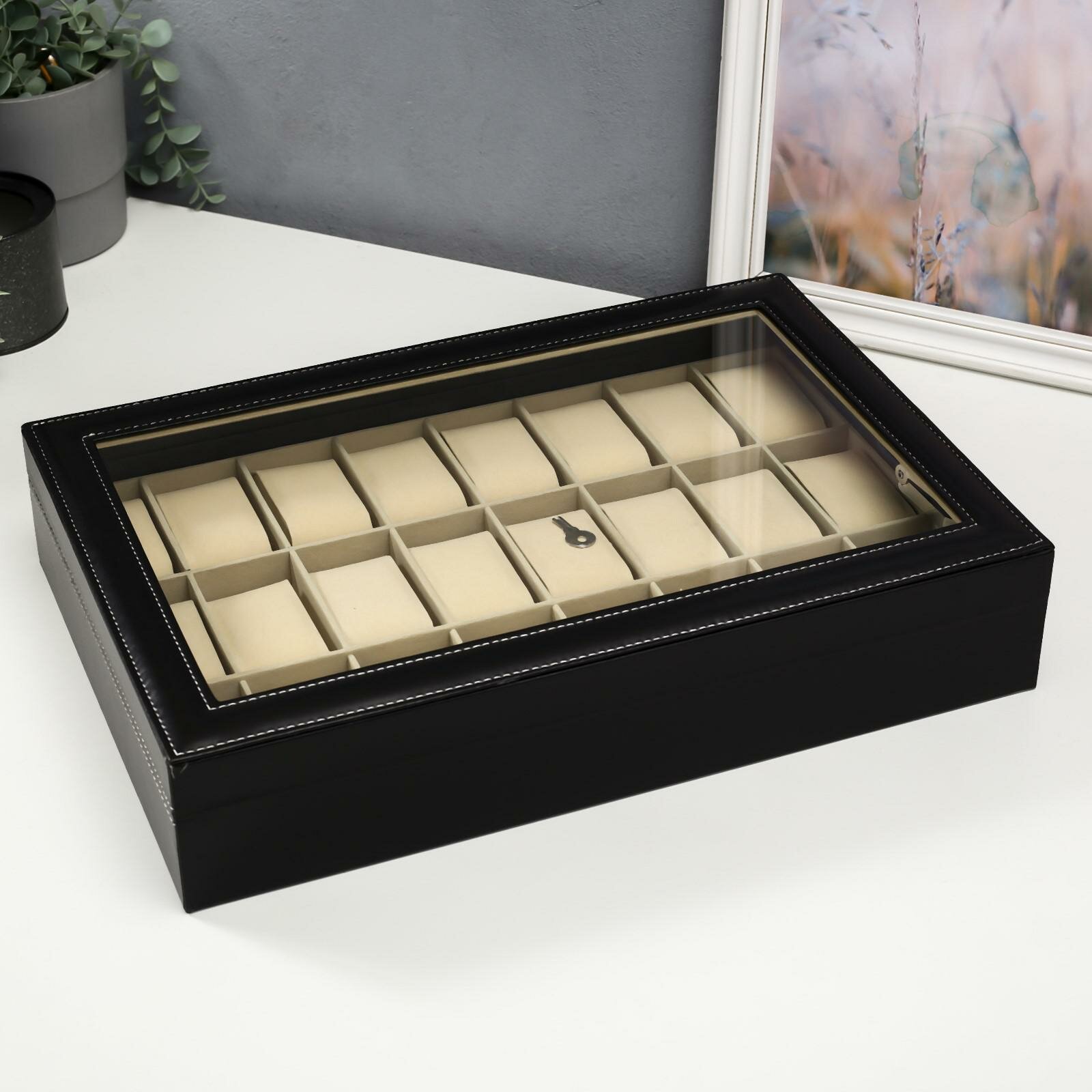 Купить Шкатулка кожзам под часы 24 отделения"Чёрная с белой строчкой" 8,5х43,5х29,5 см 3483623 .