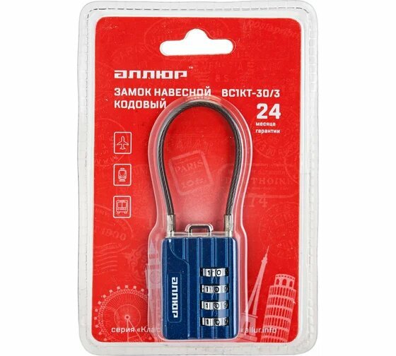 Замок навесной кодовый Аллюр ВС1КТ-30/3 (синий с тросиком)