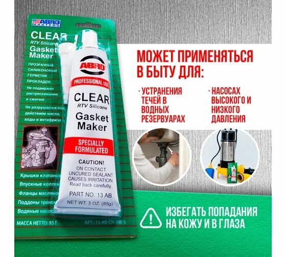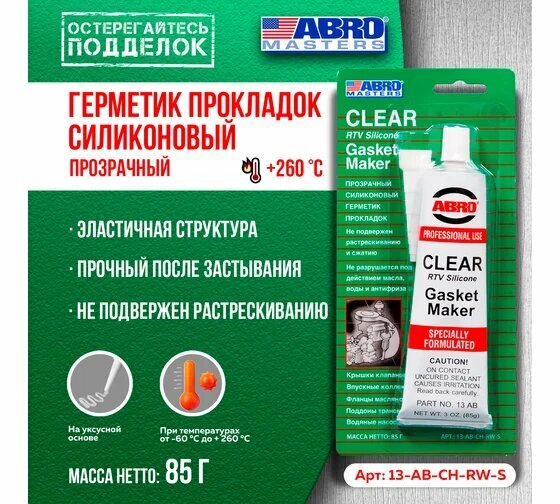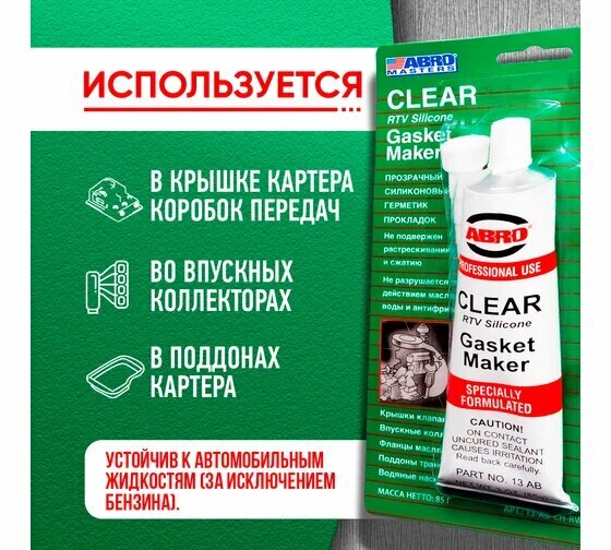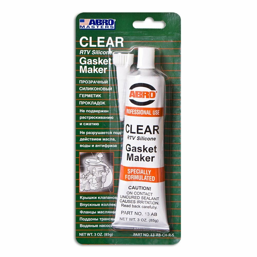 | Подробная комплектация | Герметик прокладок Abro Masters силиконовый прозрачный 85 г |