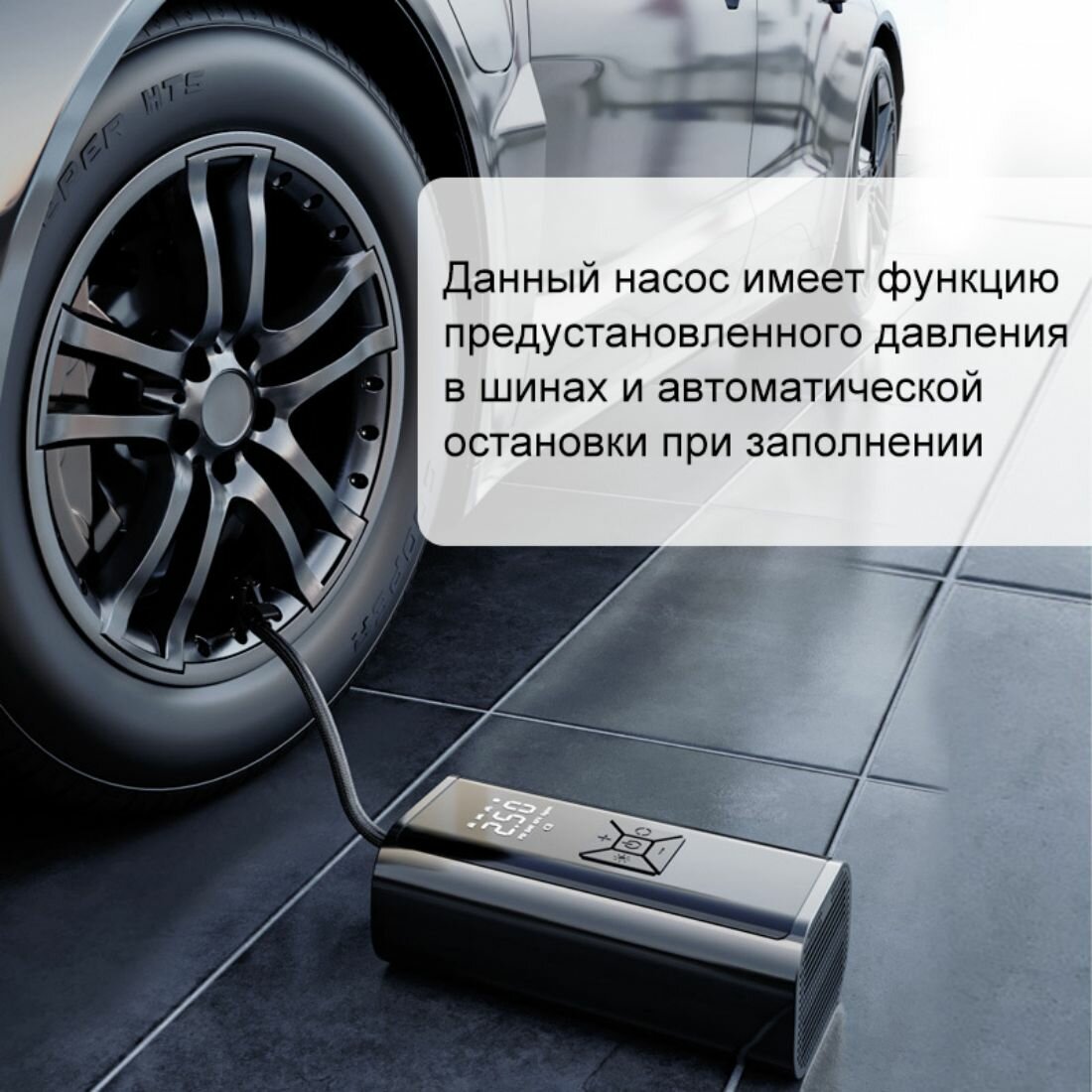 Насос автомобильный, Автомобильные компрессоры, Компрессор автомобильный, Насос автомобильный аккумуляторный, Автокомпрессор, электронасос с LED экраном, встроенным АКБ и зарядкой от USB, Компактный, Черный
