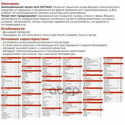 | Дополнительная информация | *Список моделей не является исчерпывающим и абсолютным, ориентируйтесь на размеры Вашего транспортного средства и соответствие их размерам тента. |