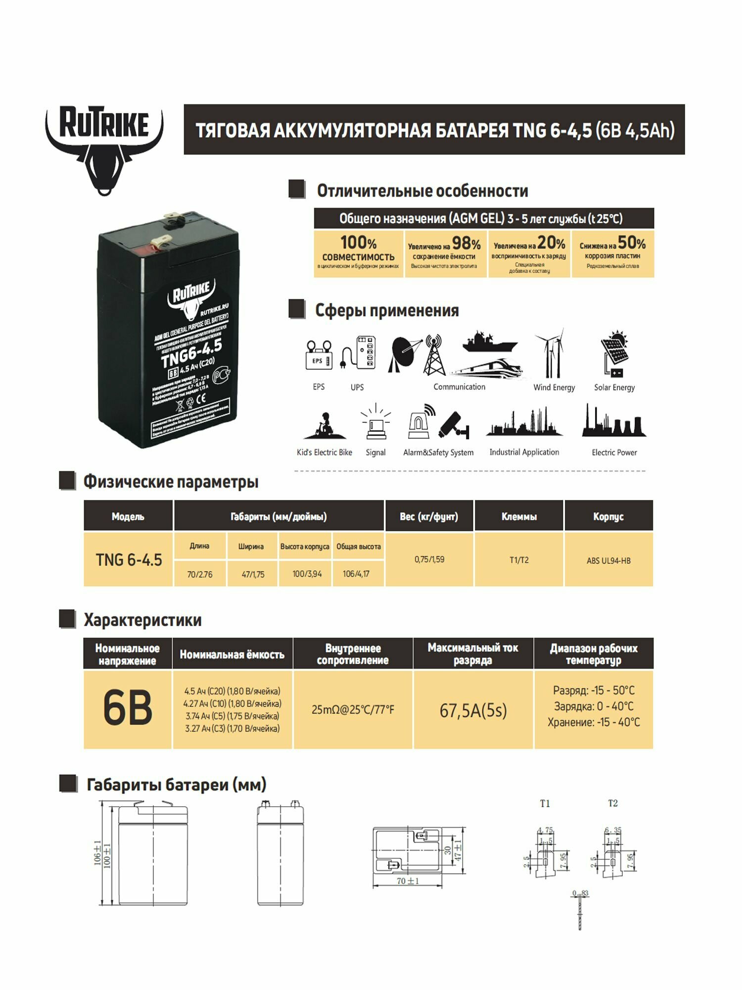 Тяговый аккумулятор RuTrike TNG6-4,5 6V 4,5Ah интересное: