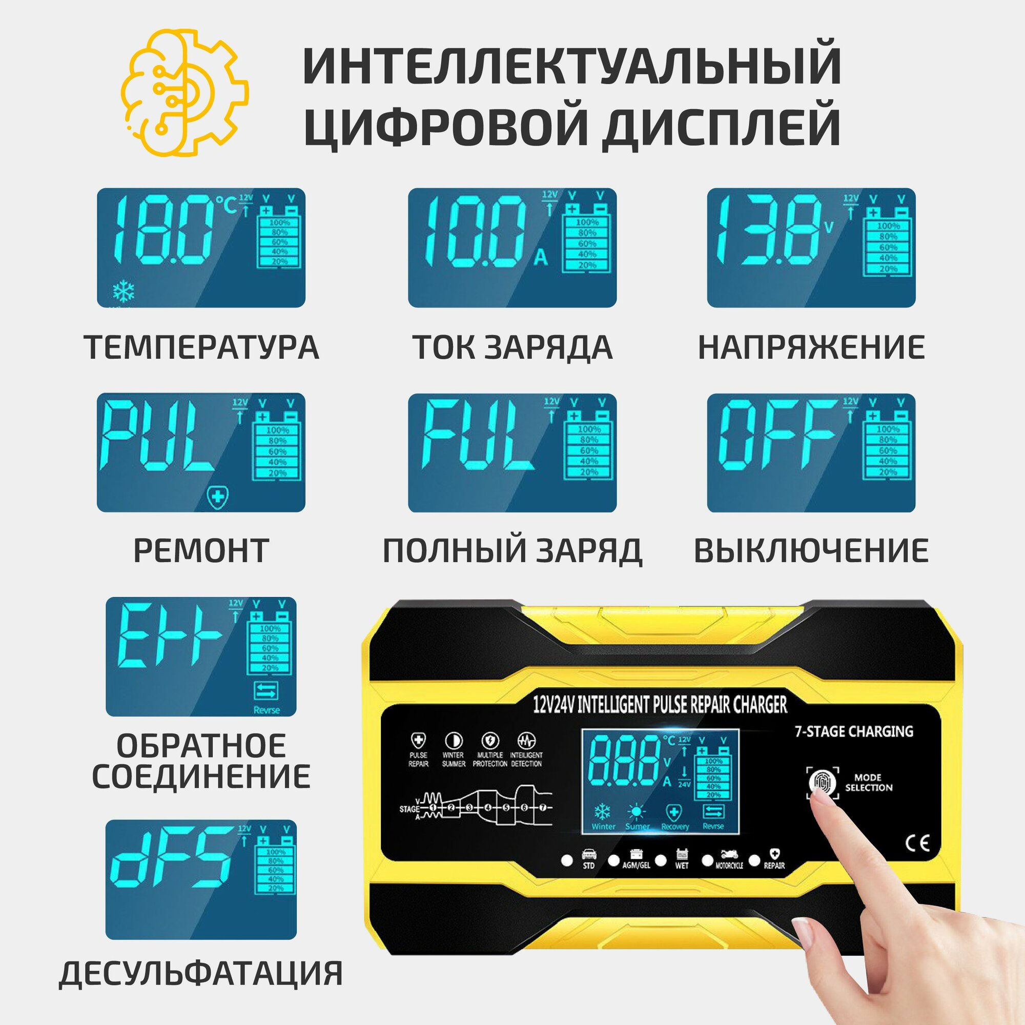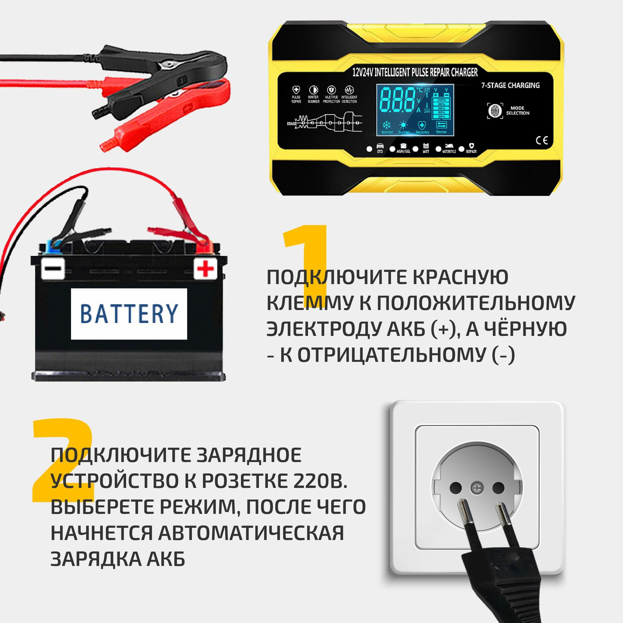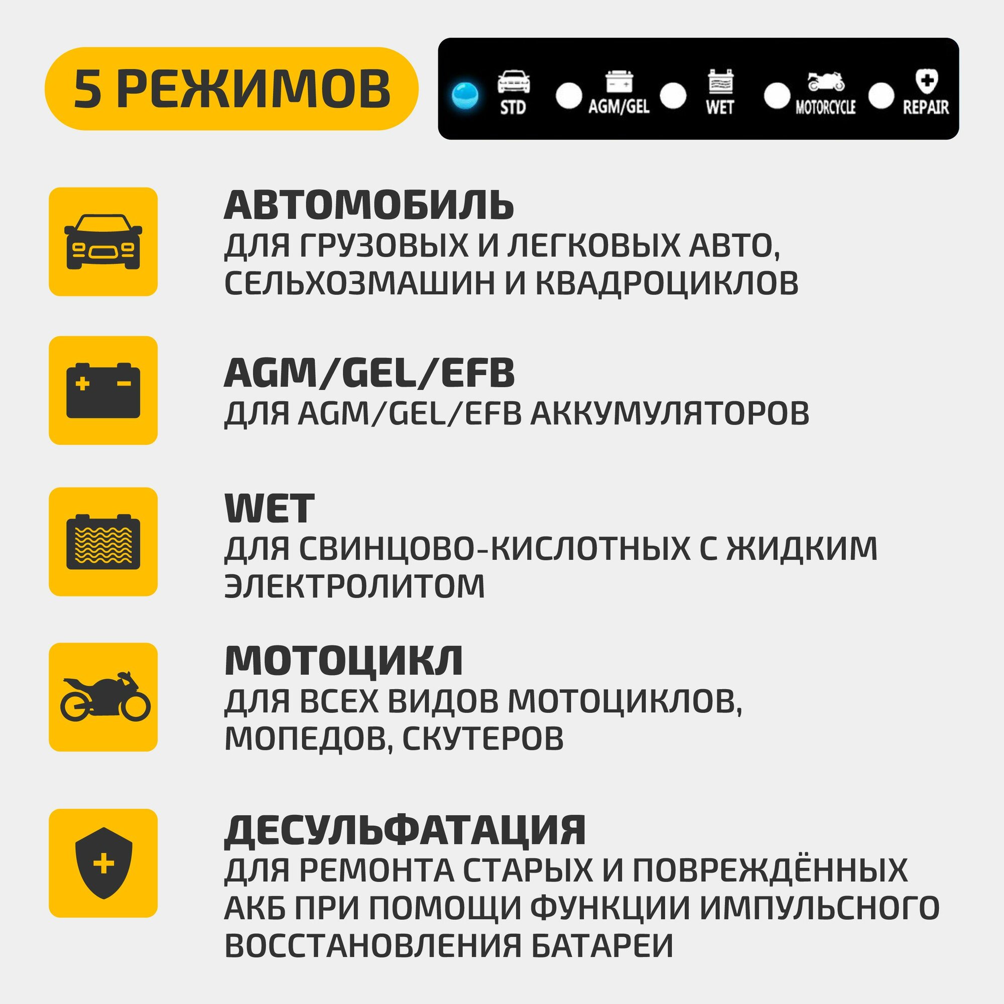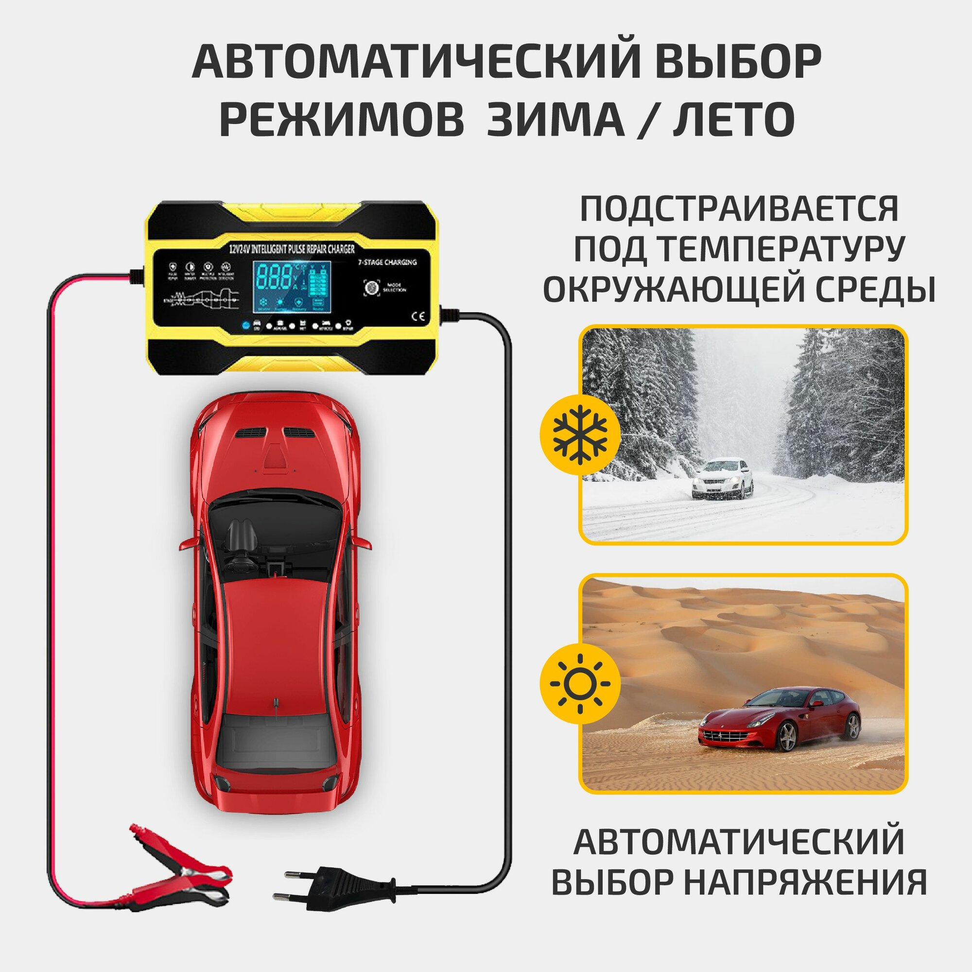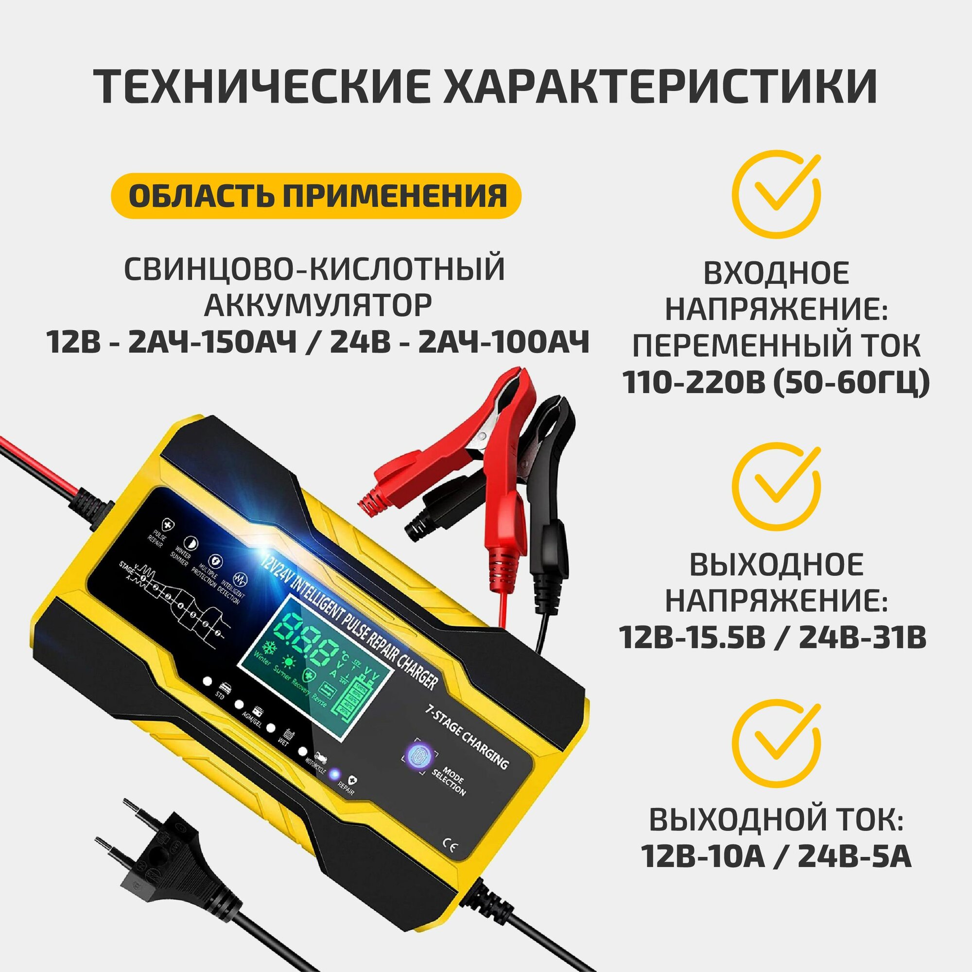 | Функции | автоматическое отключение зарядки / подходит для AGM/GEL аккумуляторов / режим зимней зарядки |