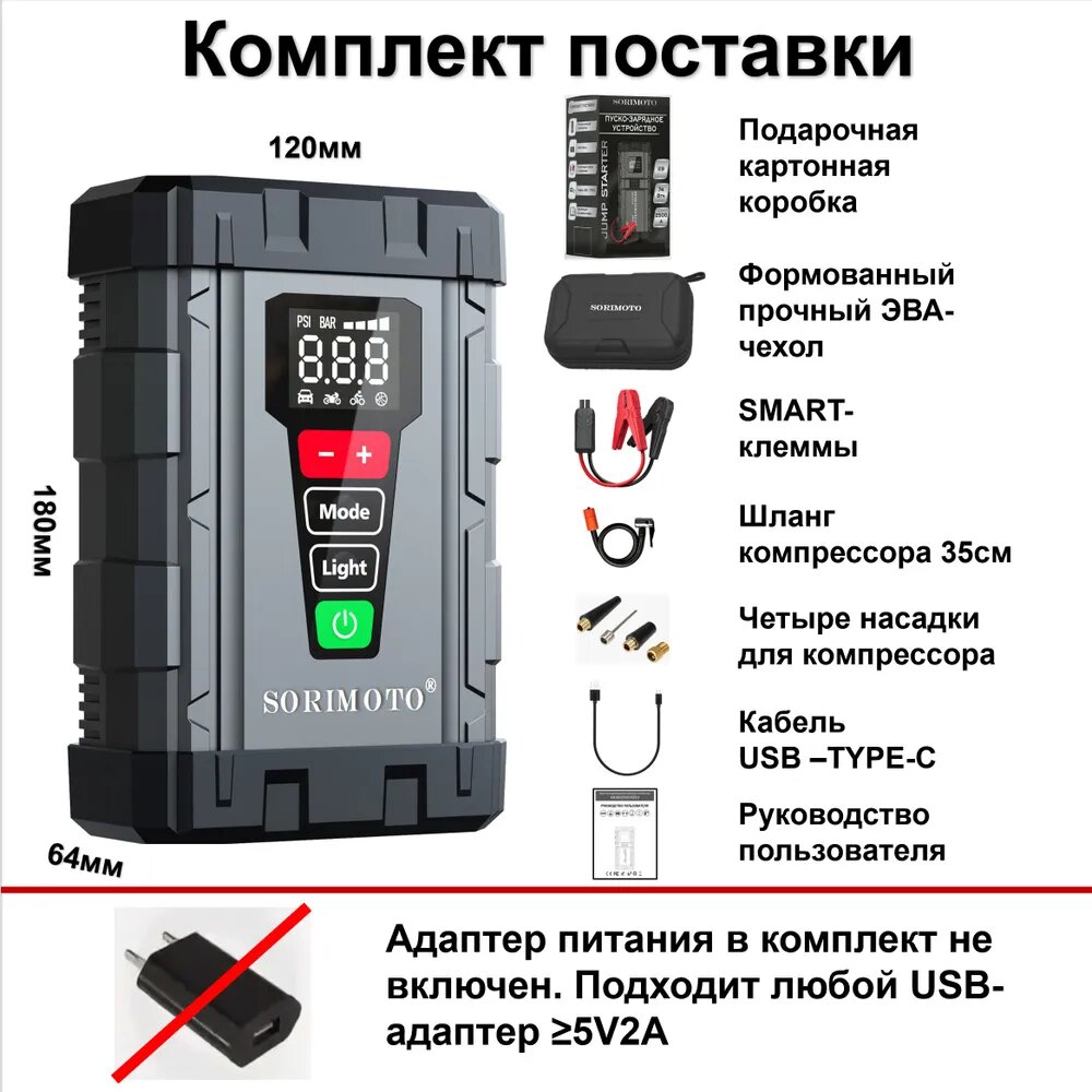 SORIMOTO X8 пусковое зарядное устройство для аккумуляторов автомобиля с компрессором, джамп стартер