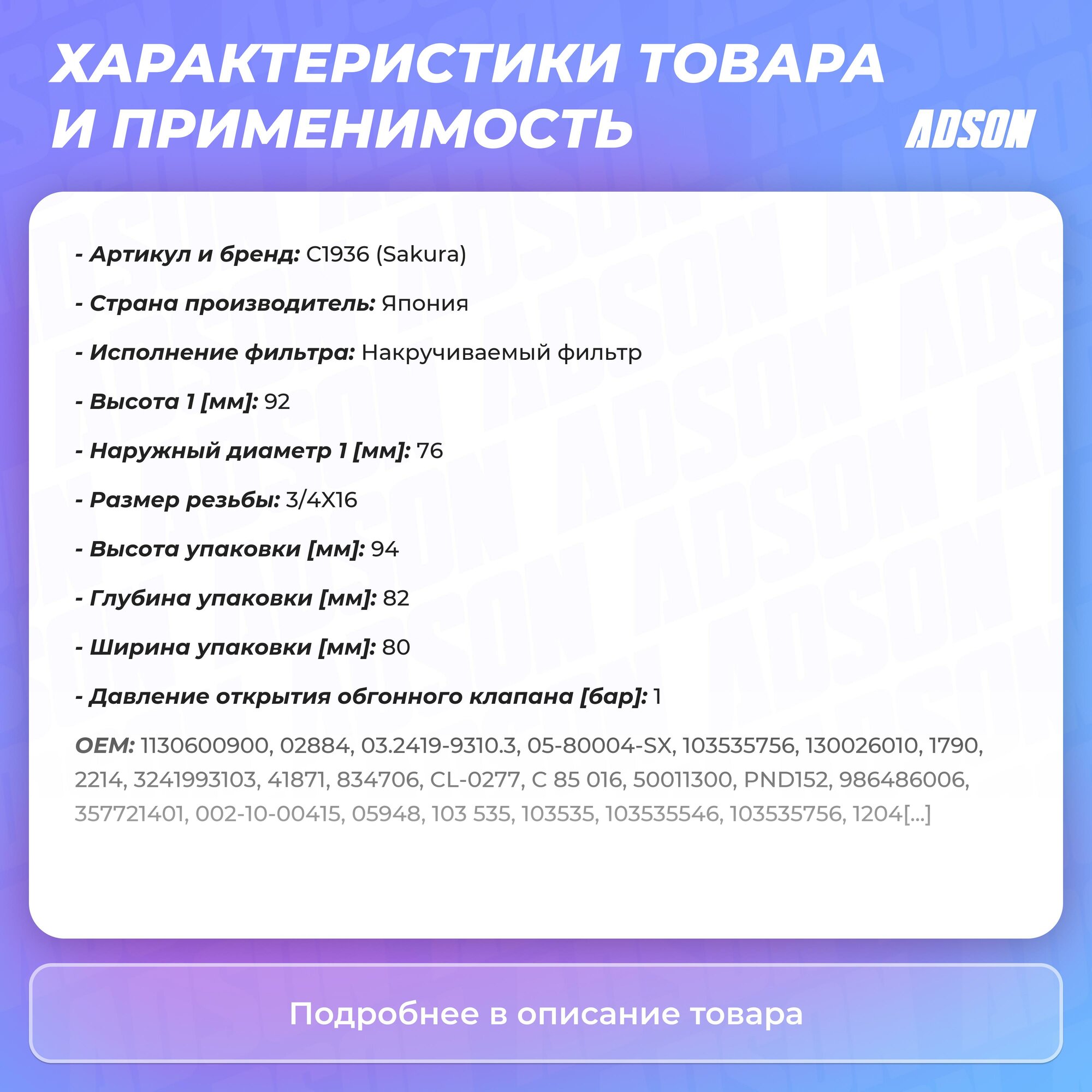 Масляный фильтр SAKURA C1936 (FORD FOCUS 1,6 2010 - по наст. время; FORD FOCUS 1,8 2006 - 2012; FORD FOCUS 1,8 2006 - 2012;) интересное: