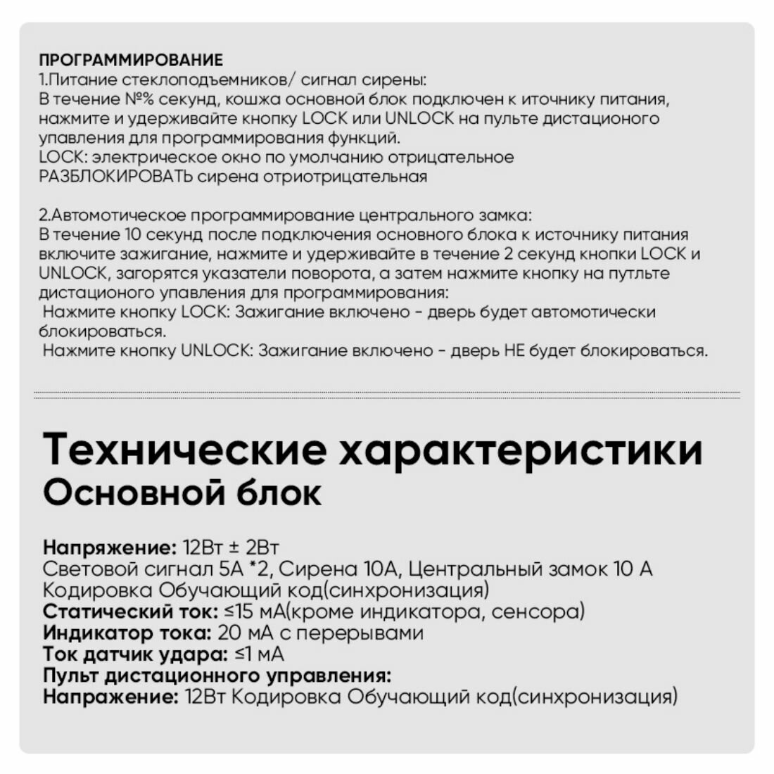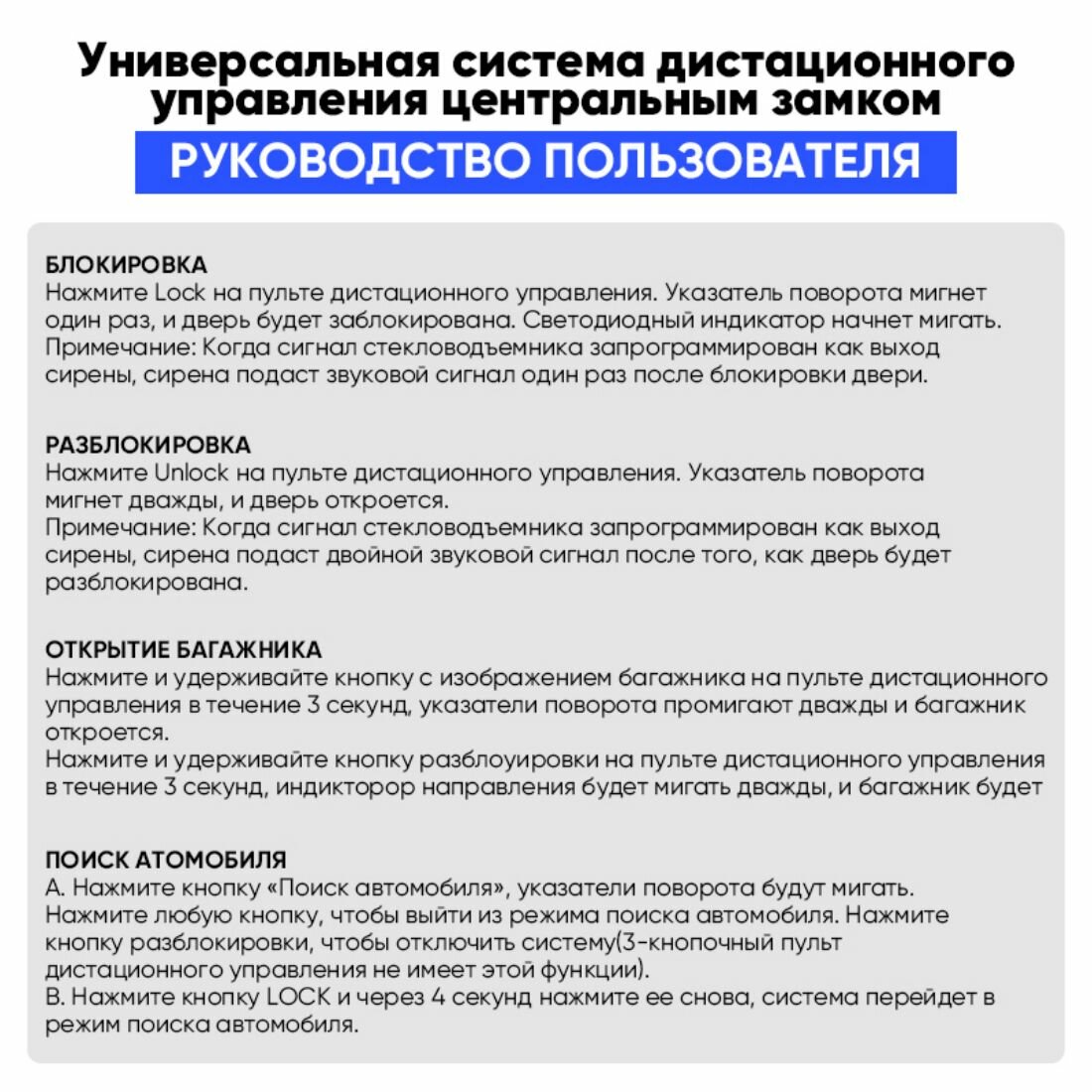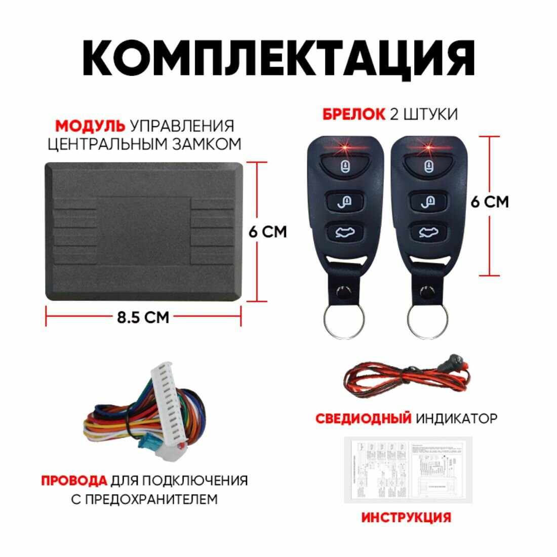 | Подробная комплектация | Блок управления центральным замком - 1 шт.; LED индикатор - 1 шт.; Разветвитель проводов с предохранителем - 1 шт.; Брелок управления центральным замком - 2 шт. |