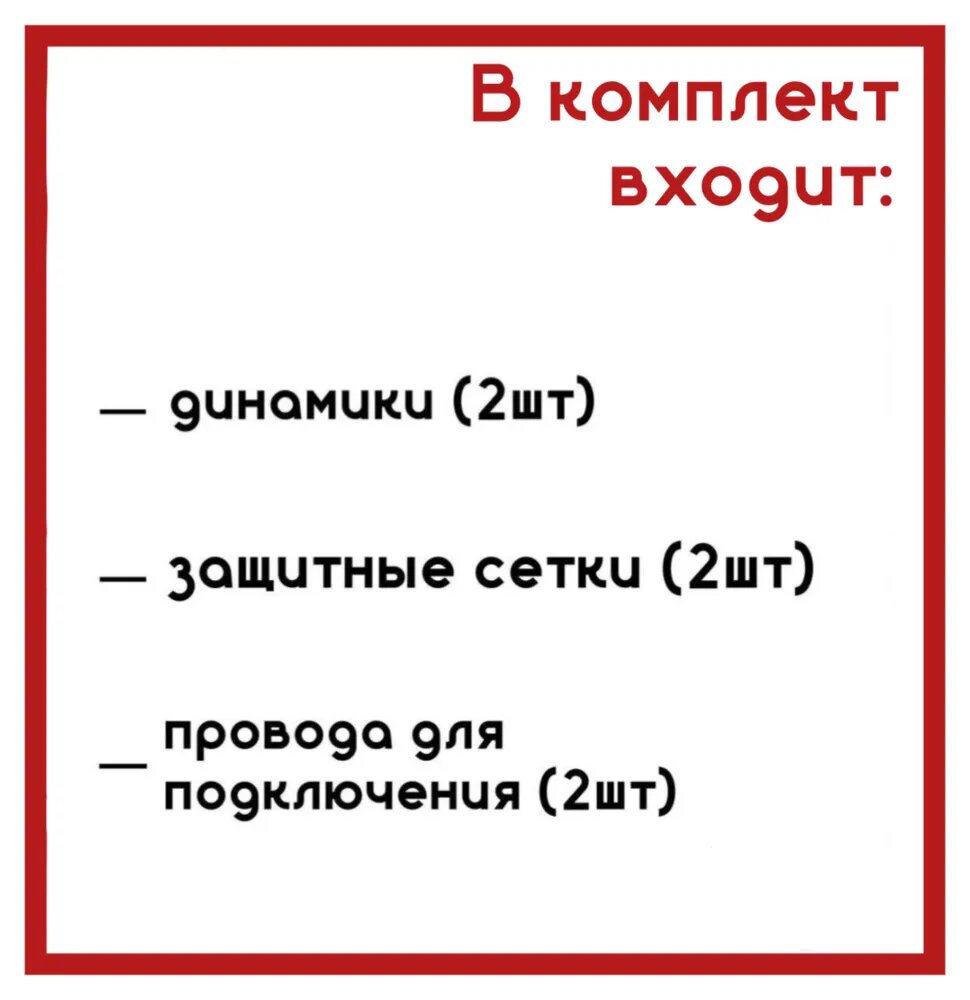 | Комплектация | Динамики (2шт Защитные сетки (2шт) Провода для подключения (2шт) |