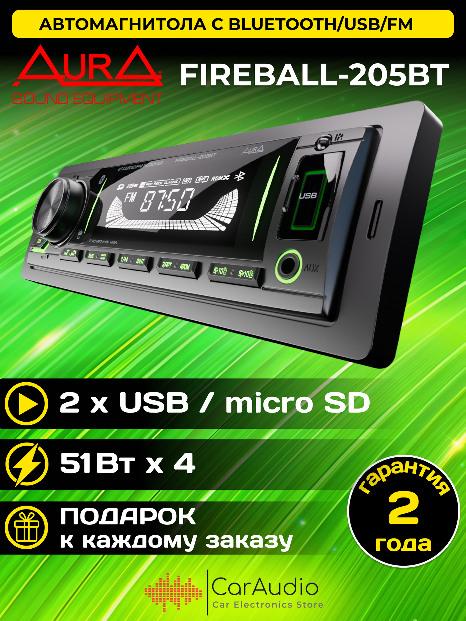 Автомагнитола Aura Usb/Sd/Fm/Bluetooth 4Х51w Зеленая Подсветка Amh/Fireball-205Bt 11492 AURA арт. AMH/FIREBALL-205BT