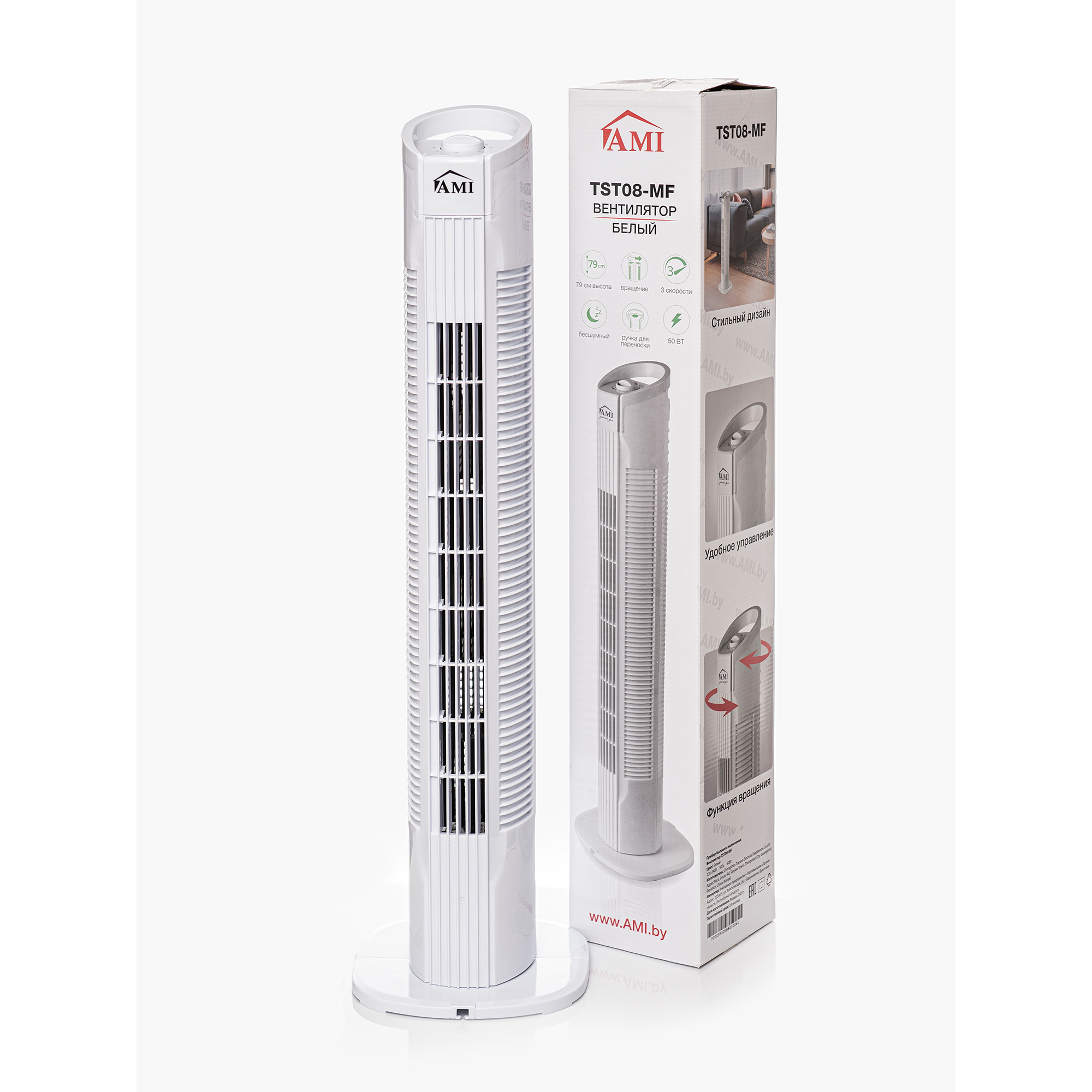 Вентилятор напольный колонный, поворотный вентилятор настольный, белый, мощность 50 W, 3 скорости, 79 см высота, Ами Мебель