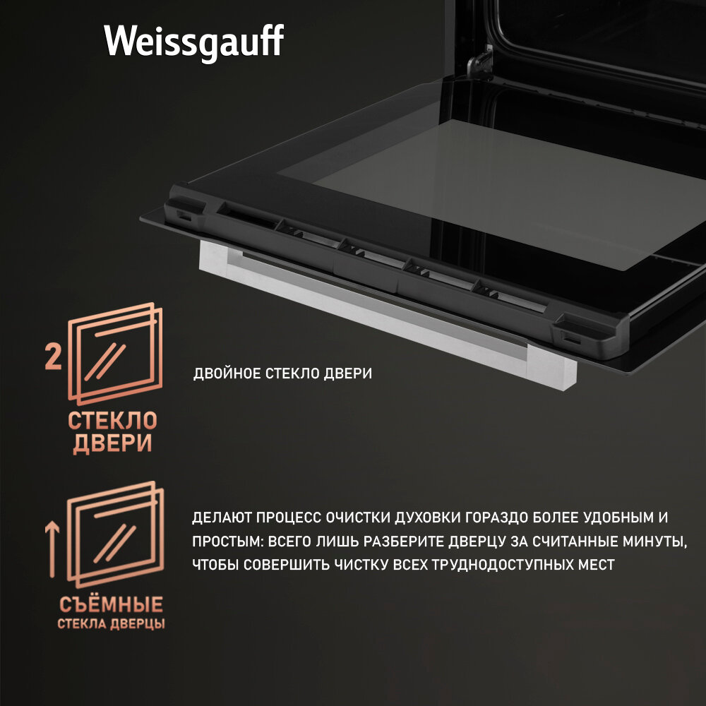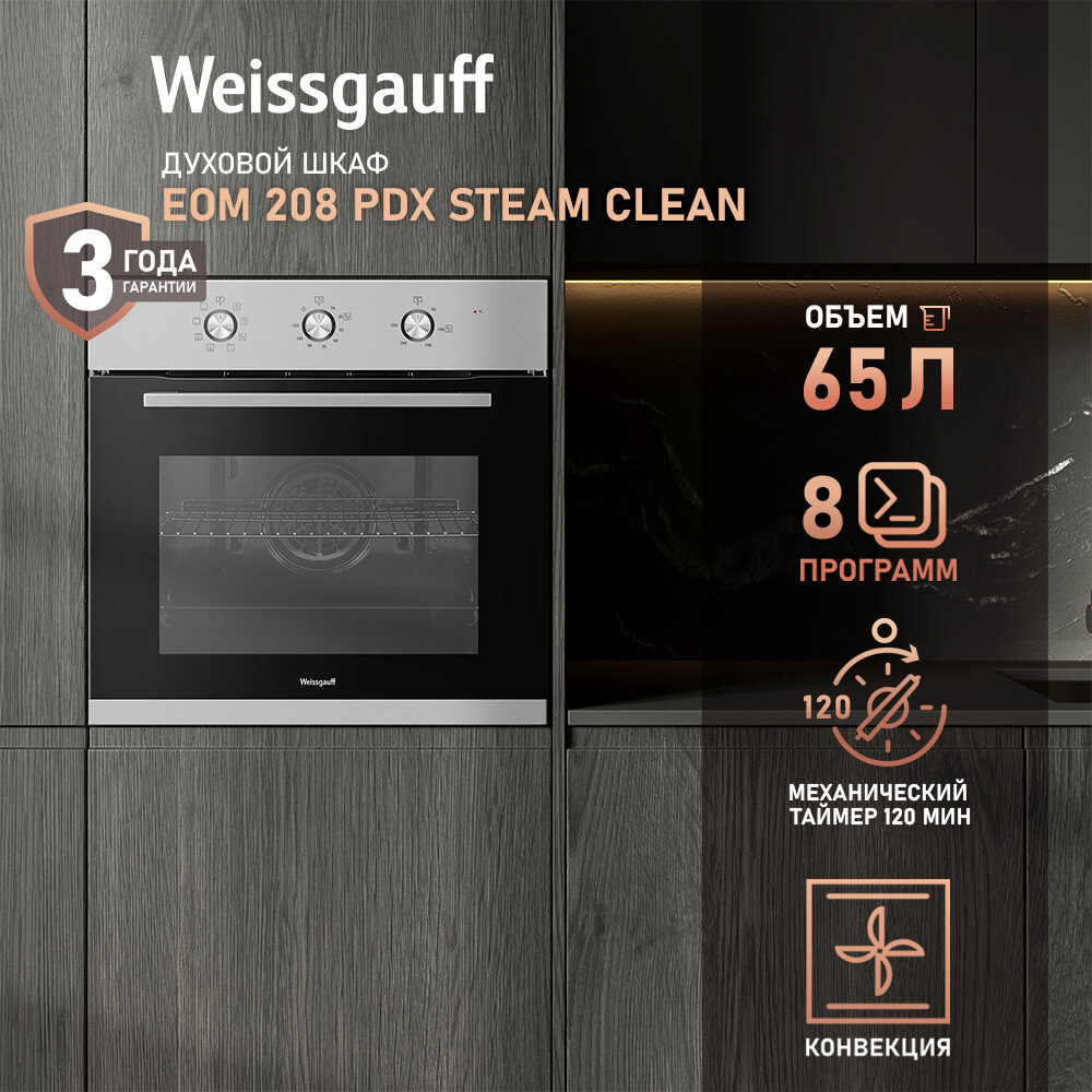 Духовой шкаф Weissgauff EOM 208 PDX Steam Clean с Конвекцией, 3 года гарантии, Большой объём 65 л, Двойное стекло дверцы, Утапливаемые ручки, 8 функций, Таймер, Гидролизная очистка, Эмаль легкой очистки