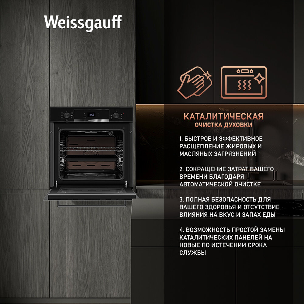 Духовой шкаф Weissgauff EOV 766 PDB конвекция, 3 года гарантии, 60 см ширина, 72 литра, утапливаемые рукоятки, 7 режимов, кольцевой нагревательный элемент, телескопические направляющие, каталитическая очистка, двойное стекло дверцы, сенсорное управление