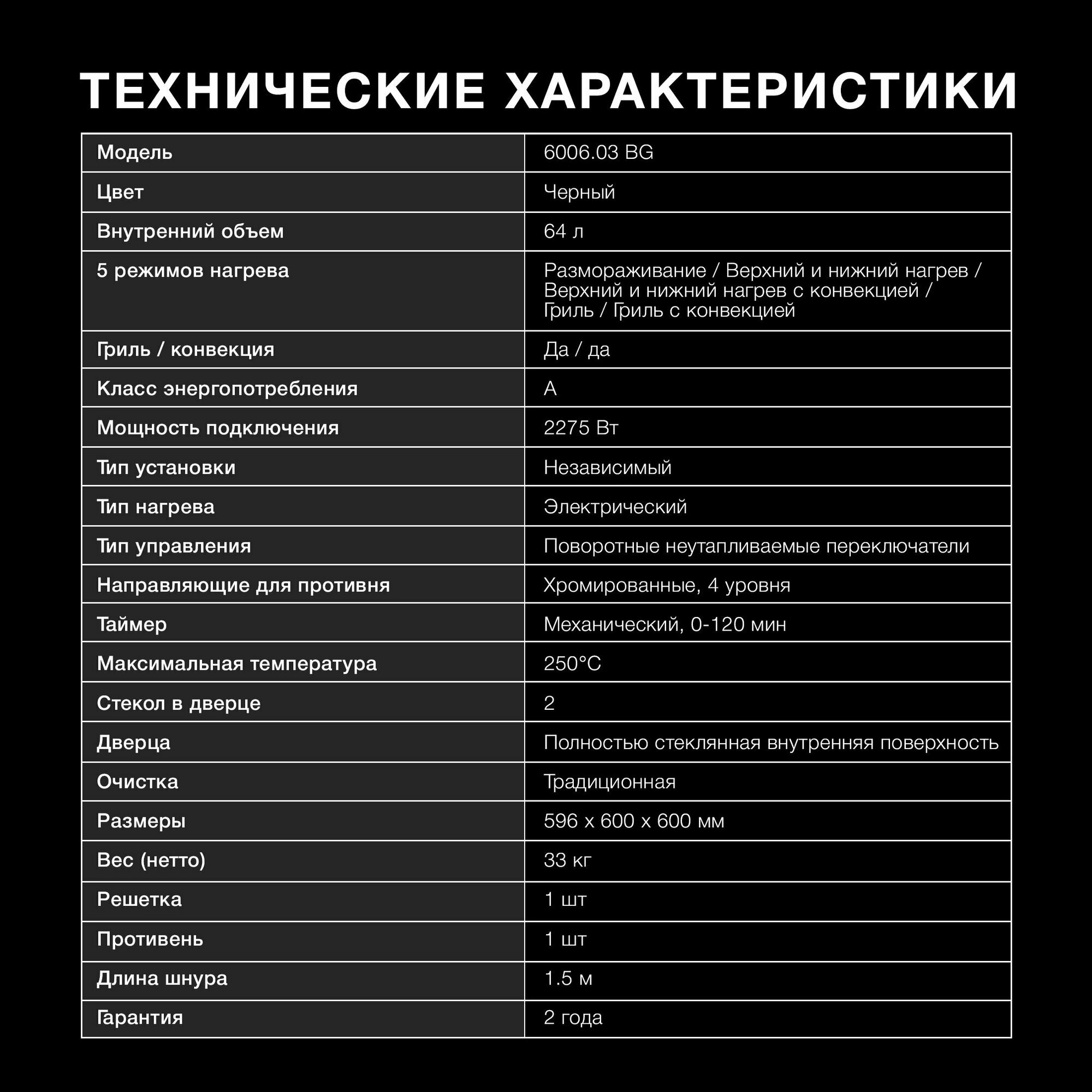 Духовой шкаф Электрический Hyundai 6006.03 BG, 5 режимов, 64л, эмаль легкой очистки, полностью стеклянная внутренняя поверхность дверцы духовки, класс энергоэффективности A, черное стекло