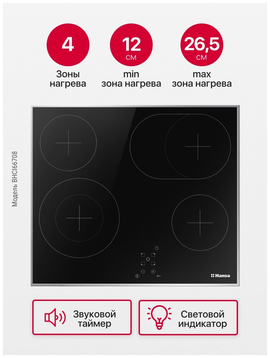 Электрическая варочная панель Hansa BHCI66708, встраиваемая, 60 см, быстрый нагрев за 10 сек, автоматика закипания, таймер автоматического отключения, стеклокерамика с сенсорным управлением