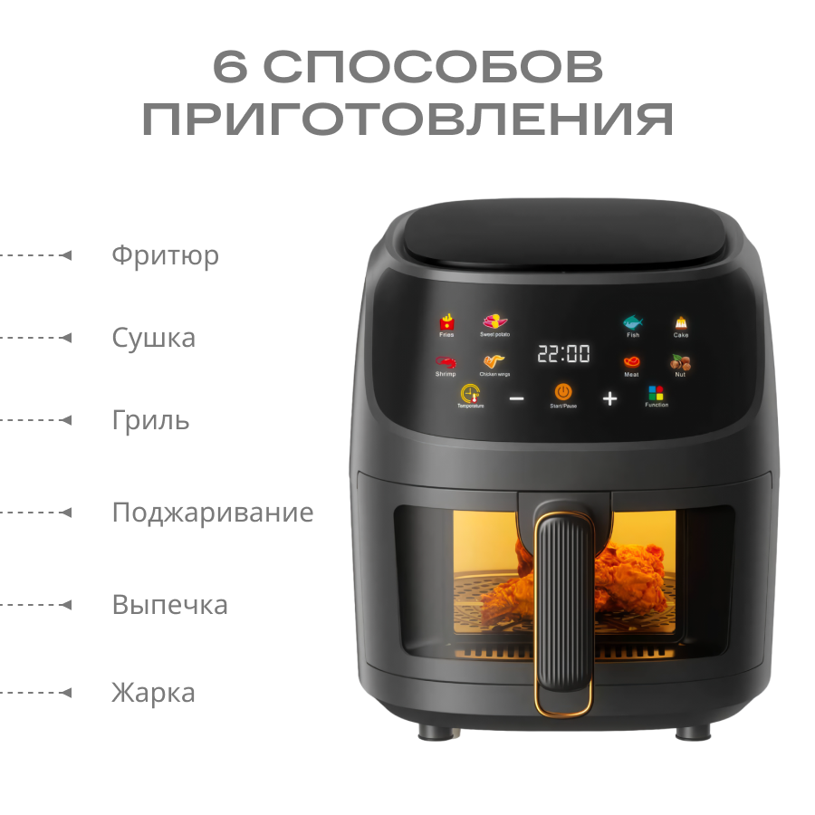 Аэрогриль 8л, черный, 1350Вт, 8 программ, регулировка температуры, таймер, вес 5кг