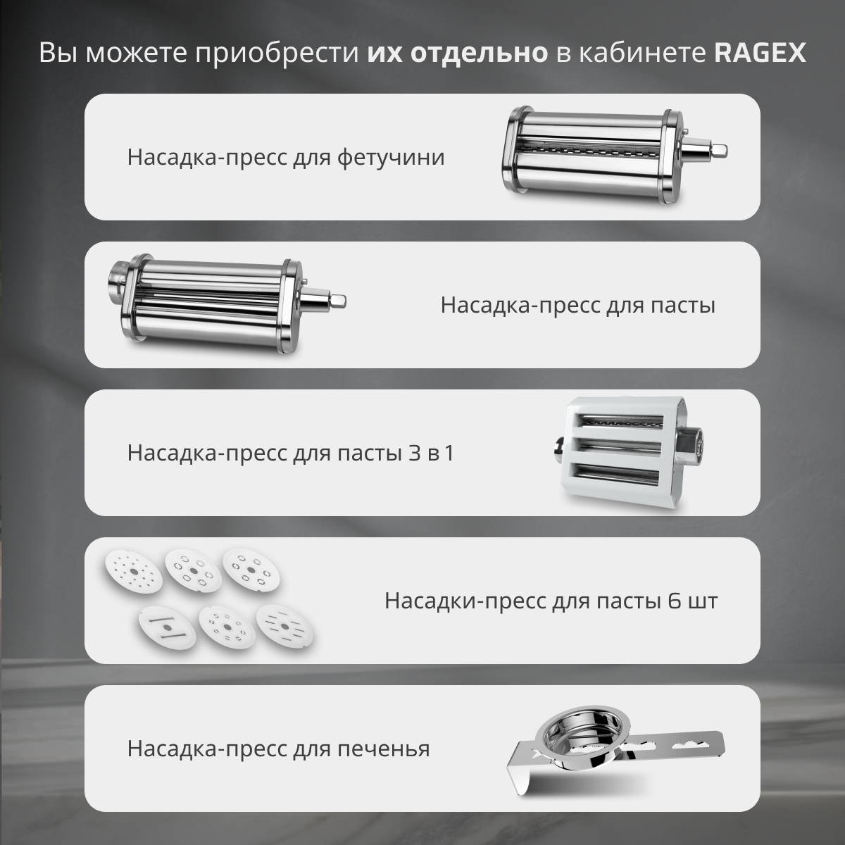 | Подробная комплектация | Кухонный комбайн RageX R101 для дома - 1 шт., крюк для теста - 1 шт., плоский битер для перемешивания - 1 шт., венчик для взбивания - 1 шт., чаша металлическая - 1 шт., чаша блендер - 1 шт., мясорубка с решетками - 1 шт., режущие лезвия - 4 шт., металлический лоток для мясорубки - 1 шт., инструкция по использованию кухонного комбайна с мясорубкой - 1 шт; упаковка - 1 шт. |